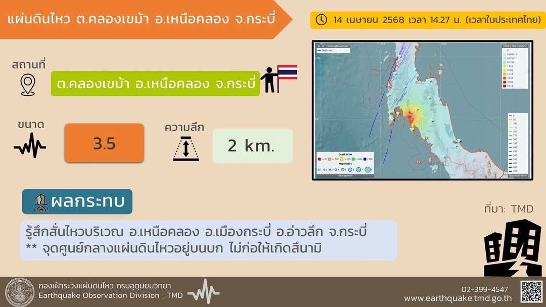 14 เม.ย. – กรมป้องกันและบรรเทาสาธารณภัย โดยศูนย์เตือนภัยพิบัติแห่งชาติ แจ้งว่า เมื่อเวลา 14.27 น. เกิดแผ่นดินไหวบนบก ขนาด 3.5 ความลึก 2 กิโลเมตร จุดศูนย์กลางอยู่บริเวณ ต.คลองเขม้า อ.เหนือคลอง จ.กระบี่ ละติจูด 8.022 องศาเหนือ ลองจิจูด 98.978 องศาตะวันออก ซึ่งแผ่นดินไหวนี้จุดศูนย์กลางอยู่บนบก จึงไม่ก่อให้เกิดสึนามิ