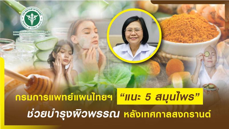 กรมการแพทย์แผนไทยฯ แนะนำ 5 สมุนไพร ที่มีสรรพคุณช่วยบำรุงผิวพรรณให้กลับคืนสู่สภาพปกติ ได้แก่ ว่านหางจระเข้ ช่วยบำรุงผิวพรรณ ช่วยให้ความชุ่มชื้นกับผิว รักษาแผลไฟไหม้น้ำร้อนลวก ช่วยลดการอักเสบ ช่วยลดอาการผิวไหม้จากแสงแดด วิธีการใช้ สามารถใช้ได้ทั้งรูปแบบเจล หรือนำวุ้นใสจากใบว่านหางจระเข้ โดยนำใบมาปอกเปลือก ล้างยางออกให้หมด เพราะอาจทำให้เกิดการระคายเคืองได้ น้ำผึ้ง ช่วยเพิ่มความชุ่มชื้นให้กับผิว และมีฤทธิ์ยับยั้งแบคทีเรีย ช่วยลดสิว ขมิ้นชัน แก้อาการผื่นคัน แก้น้ำกัดเท้า ลดอาการแพ้ของผิว ช่วยบำรุงผิวพรรณ แตงกวา ช่วยให้ผิวชุ่มชื้น ช่วยลดความหยาบกร้านของผิว ลดการอักเสบของผิว และบัวบก ใช้บรรเทาอาการผด ผื่นคัน ช่วยลดการอักเสบของผิว สมานผิว สามารถใช้ในรูปแบบครีม หรือผลิตภัณฑ์ดูแลผิวที่มีส่วนผสมของบัวบก เป็นต้น