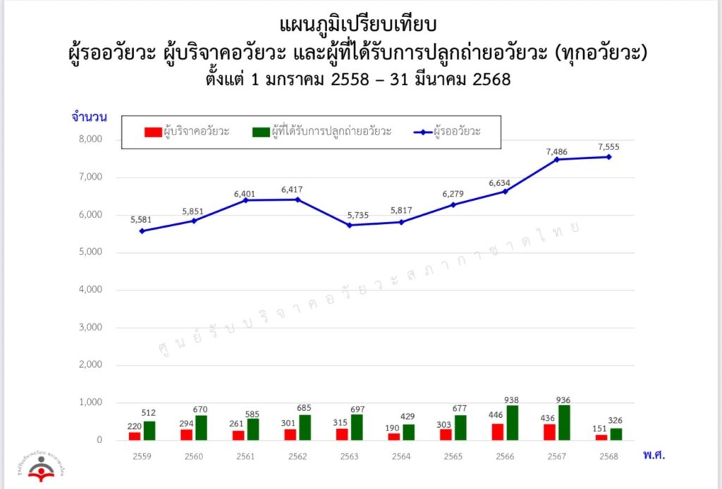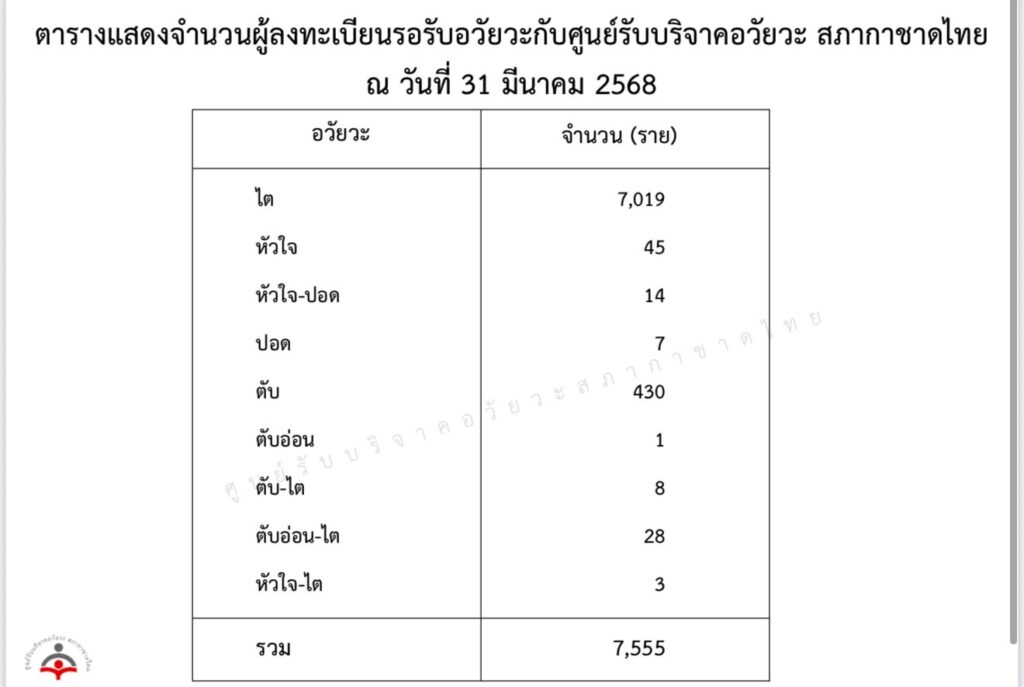 ทั้งนี้ ข้อมูลจำนวนผู้ลงทะเบียนรอรับอวัยวะกับศูนย์รับบริจาคอวัยวะ สภากาชาดไทย ณ วันที่ 31 มีนาคม 2568 อยู่ที่ 7,555 คน แบ่งเป็น ไต มากที่สุด 7,019 คน, ตับ 430 คน, หัวใจ 45 คน, ตับอ่อน-ไต 28 คน, หัวใจ-ปอด 14 คน, ตับ-ไต 8 คน, ปอด 7 คน, หัวใจ-ไต 3 คน และตับอ่อน 1 คน