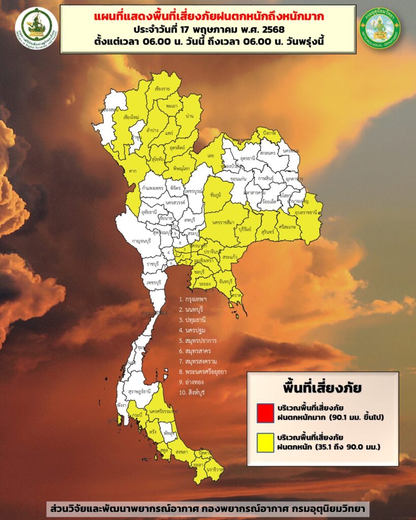 กทม. 17 พ.ค.- กรมอุตุฯ เผยเกือบทั่วทุกภาคของไทยมีฝนฟ้าคะนองและตกหนักบางแห่ง อาจเกิดน้ำท่วมฉับพลัน-น้ำป่าไหลหลาก
