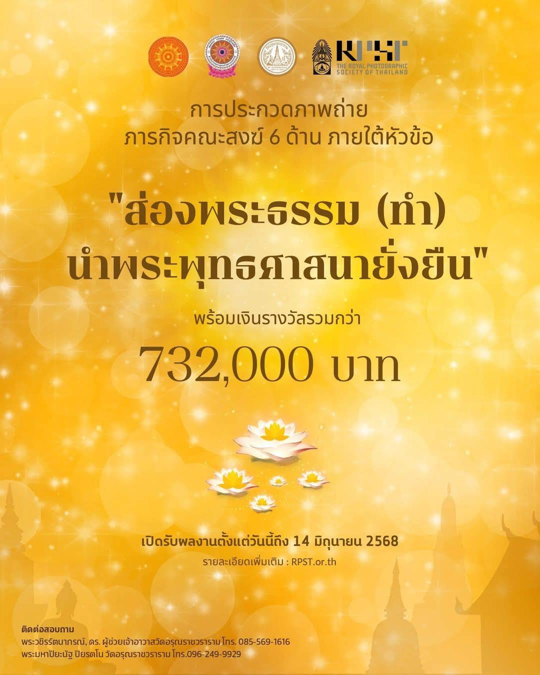สำนักงานพระพุทธศาสนาแห่งชาติ จึงร่วมกับ วัดอรุณราชวราราม และสมาคมถ่ายภาพแห่งประเทศไทย ในพระบรมราชูปถัมภ์ จัดโครงการเสริมสร้างภาพลักษณ์ที่ดีขององค์กรและคณะสงฆ์ไทย การประกวดภาพถ่ายภารกิจคณะสงฆ์ 6 ด้าน ภายใต้หัวข้อ “ส่องพระธรรม (ทำ) นำพระพุทธศาสนายั่งยืน” โดยเปิดรับผลงานตั้งแต่วันนี้ ถึงวันที่ 14 มิถุนายน 2568 และจะพิจารณาคัดเลือกผลงานโดยคณะกรรมการผู้ทรงคุณวุฒิ เพื่อรับประทานโล่รางวัลจาก สมเด็จพระอริยวงศาคตญาณ สมเด็จพระสังฆราช สกลมหาสังฆปริณายก ทั้งนี้ ภาพถ่ายทั้งหมดจะจัดเก็บเป็นคลังข้อมูลของสำนักงานพระพุทธศาสนาแห่งชาติ สำหรับนำมาใช้ประโยชน์ในการผลิตสื่อประชาสัมพันธ์ และใช้เผยแพร่ในสื่อต่าง ๆ ของสำนักงานพระพุทธศาสนาแห่งชาติต่อไป ทั้งนี้ผู้ที่สนใจสามารถร่วมส่งภาพเข้าประกวด และรายละเอียดกติกาเพิ่มเติมได้ที่ :https://rpst.or.th/home/gallerydetails.php?id=121 .-สำนักข่าวไทย 612