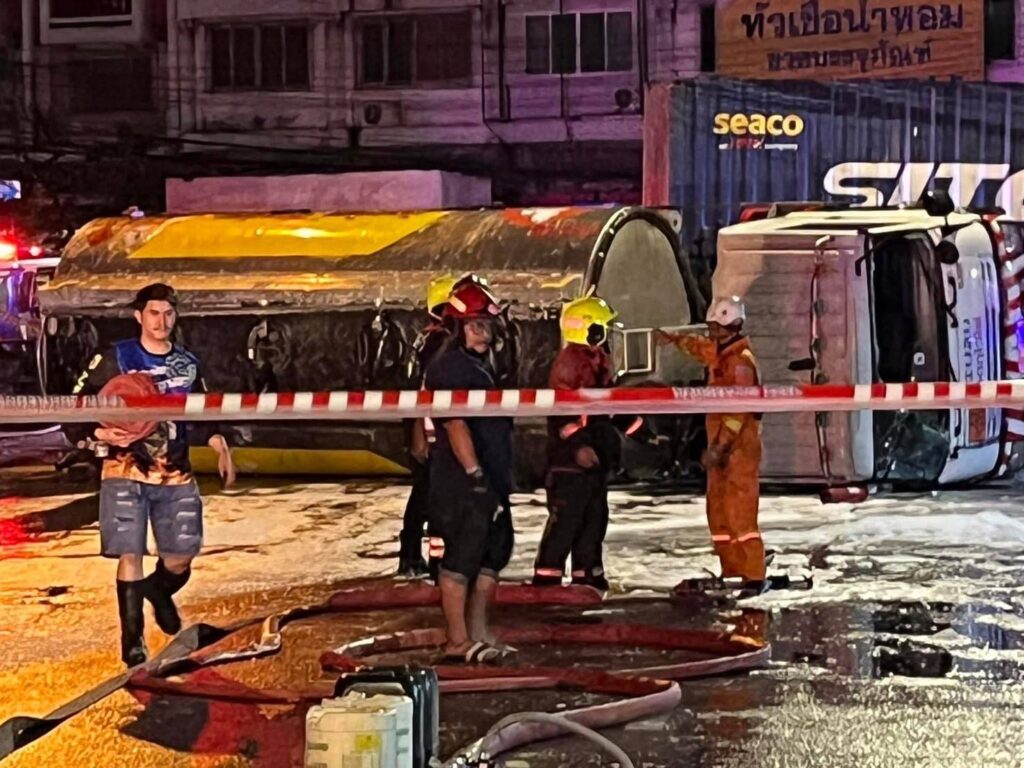 ด้วยเหตุรถบรรทุกน้ำมันเชื้อเพลิงพลิกคว่ำ ในวันที่ 24 พฤษภาคม 2568 เวลา 00.01 น. บริเวณซอยสุขสวัสดิ์ 27 ถนนสุขสวัสดิ์ เขตราษฎร์บูรณะ กรุงเทพมหานคร ลักษณะที่เกิดเหตุ เป็นรถบรรทุกตู้คอนเทนเนอร์ชนกับรถบรรทุกน้ำมัน ดังนี้ คันที่ 1 รถเทรลเลอร์บรรทุกตู้คอนเทนเนอร์ คันที่ 2 รถบรรทุกน้ำมันรวมทั้งสิ้น 16,000 ลิตร ในที่เกิดเหตุไม่มีแสงเพลิง แต่มีน้ำมันที่บรรทุกมารั่วไหล เฉพาะน้ำมันเบนซิน ประมาณ 600 ลิตร เจ้าหน้าที่ดับเพลิงใช้น้ำยาโฟมดับเพลิงทำการป้องกันการจุดติดของเชื้อเพลิง ดำเนินการเก็บกู้ซากรถในที่เกิดเหตุ ทำการถ่ายน้ำมันภายในแทงค์น้ำมันออก และทำความสะอาดน้ำมันที่รั่วไหลบนพื้นผิวจราจร ร่วมกับสำนักงานเขตราษฎร์บูรณะ เป็นที่เรียบร้อย ข้อสันนิษฐานเบื้องต้นสาเหตุเกิดจากอุบัติเหตุ เนื่องจากรถเทรลเลอร์บรรทุกตู้คอนเทนเนอร์ ชนกับรถบรรทุกน้ำมัน ที่เกิดเหตุมีผู้ได้รับบาดเจ็บบริเวณศีรษะ เป็นเพศชาย จำนวน 1 ราย อาสาสมัครปฐมพยาบาลในที่เกิดเหตุและนำตัวส่งโรงพยาบาลราษฎร์บูรณะ พื้นที่รับผิดชอบของสถานีดับเพลิงและกู้ภัยราษฎร์บูรณะ.-417-สำนักข่าวไทย