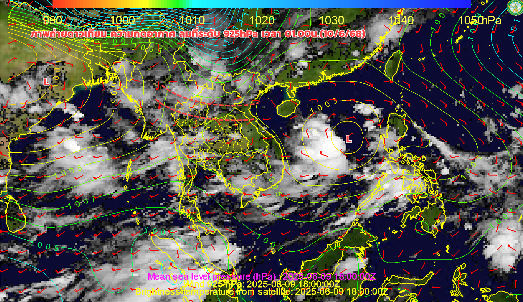 กรุงเทพฯ 10 มิ.ย.-กรมอุตุฯ ระบุหย่อมความกดอากาศต่ำในทะเลจีนใต้ทวีกำลังเป็นพายุดีเปรสชันแล้ว ส่งผลให้มรสุมตะวันตกเฉียงใต้ที่พัดปกคลุมประเทศไทยและทะเลอันดามันมีกำลังแรงขึ้น ทำให้ช่วง 10-12 มิ.ย.นี้ ประเทศไทยจะมีฝนเพิ่มขึ้นและมีฝนตกหนักบางแห่ง โดยเฉพาะบริเวณด้านรับมรสุมและพื้นที่ใกล้ร่องมรสุม
