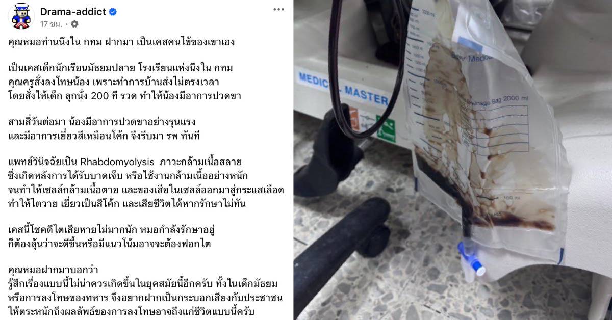 กรณีเฟซบุ๊ก Drama-addict โพสต์เตือนภัย หลังจากคุณหมอท่านนึ่งใน กทม.ที่ฝากมา เป็นเคสคนไข้ของคุณหมอเอง ที่มีครูโรงเรียนมัธยมศึกษาแห่งหนึ่ง ในกรุงเทพมหานคร สั่งลงโทษนักเรียนด้วยการลุกนั่ง 200 ครั้ง เพราะทำการบ้านส่งไม่ตรงเวลา ทำให้น้องมีอาการปวดขา สามสี่วันต่อมา น้องมีอาการปวดขาอย่างรุนแรง และมีอาการปัสสาวะสีดำ จึงรีบมา รพ. ทันที