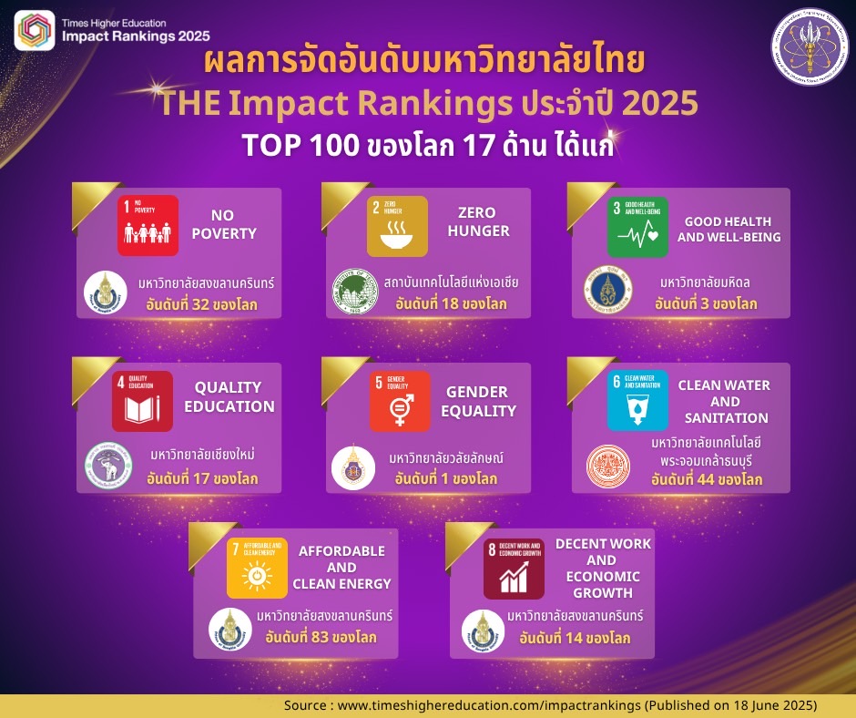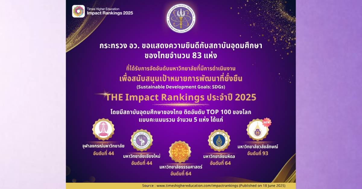ศ.ดร.ศุภชัย ปทุมนากุล ปลัดกระทรวงการอุดมศึกษา วิทยาศาสตร์ วิจัยและนวัตกรรม (อว.) เปิดเผยว่า Times Higher Education (THE) หน่วยงานด้านการจัดอันดับสถาบันอุดมศึกษาชั้นนำของโลก ได้ประกาศผลการจัดอันดับสถาบันอุดมศึกษาที่มีการดำเนินงานเพื่อสนับสนุนเป้าหมายการพัฒนาที่ยั่งยืน (Sustainable Development Goals: SDGs) หรือ THE Impact Rankings ประจำปี 2568 โดยในปีนี้มีสถาบันอุดมศึกษาทั่วโลก เข้าร่วมการจัดอันดับทั้งหมด 2,526 แห่ง จาก 130 ประเทศและเขตเศรษฐกิจทั่วโลก และมีสถาบันอุดมศึกษาไทยเข้ารับการจัดอันดับทั้งสิ้น 83 แห่ง เพิ่มจากปี 2567 ซึ่งมีจำนวน 77 แห่ง ซึ่งผลการจัดอันดับปรากฎว่า มี 5 สถาบันอุดมศึกษาไทยอยู่ในอันดับ Top 100 ของโลก แบบคะแนนรวม ได้แก่ จุฬาลงกรณ์มหาวิทยาลัยและมหาวิทยาลัยเชียงใหม่ อันดับที่ 44 มหาวิทยาลัยมหิดลและมหาวิทยาลัยธรรมศาสตร์ อันดับที่ 64 และมีมหาวิทยาลัยวลัยลักษณ์ อันดับที่ 93 ซึ่งขยับมาอยู่ในอันดับ Top 100 เป็นปีแรก อีกทั้งยังเป็นสถาบันอุดมศึกษาอันดับ 1 ของโลกที่ได้รับคะแนนสูงสุดในการดำเนินงาน SDGs เป้าหมายที่ 5 ความเท่าเทียมทางเพศ (Gender equality) นอกจากนี้ ยังมีสถาบันอุดมศึกษาไทยอีกหลายแห่งที่ได้รับการจัดอันดับที่ 101-200 ของโลก ได้แก่ สถาบันเทคโนโลยีแห่งเอเชีย (AIT) มหาวิทยาลัยเกษตรศาสตร์มหาวิทยาลัยขอนแก่น มหาวิทยาลัยเทคโนโลยีพระจอมเกล้าธนบุรี และมหาวิทยาลัยสงขลานครินทร์