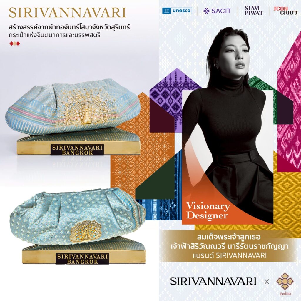 กิจกรรมสำคัญในงานนี้ ได้รับพระกรุณาธิคุณจากสมเด็จพระเจ้าลูกเธอ เจ้าฟ้าสิริวัณณวรี นารีรัตนราชกัญญา ผู้อำนวยการฝ่ายสร้างสรรค์ ของแบรนด์ “SIRIVANNAVARI” กับผลงานการออกแบบกระเป๋าคลัตช์ 2 ใบอันทรงคุณค่าโดยแบรนด์ SIRIVANNAVARI ภายใต้วิสัยทัศน์ของสมเด็จพระเจ้าลูกเธอ เจ้าฟ้าสิริวัณณวรี นารีรัตนราชกัญญา ที่วิจิตรงดงามด้วยงานปักอันประณีตโดยทีมช่างผู้ชำนาญแห่ง SIRIVANNAVARI Atelier & Academy กระเป๋าใบแรกเลอค่า ด้วยงานปักลายนกยูงสีทองอันเปล่งประกาย ซึ่งเป็นสัญลักษณ์ของแบรนด์ SIRIVANNAVARI ส่วนหางนกยูงที่รำแพน ใช้สัญลักษณ์รวงข้าวอันสื่อถึงความอุดมสมบูรณ์และความเจริญรุ่งเรือง มีการปักประดับด้วยปล้องแก้วและคริสตัลอันระยิบระยับ ส่วนใบที่สอง เป็นการปักลวดลายล้อไปกับลายผ้าทอ เพื่อเสริมให้ลวดลายดูมีมิติและโดดเด่นมากยิ่งขึ้น