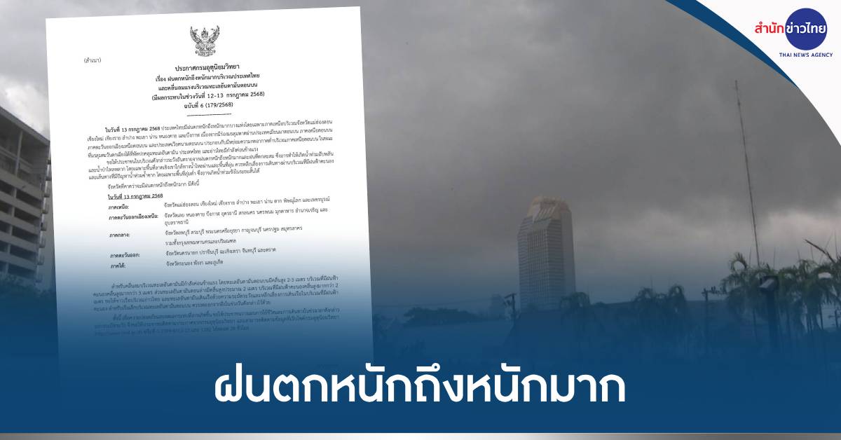 กรมอุตุนิยมวิทยา ประกาศฉบับที่ 6 เรื่อง ฝนตกหนักถึงหนักมากบริเวณประเทศไทยและคลื่นลมแรงบริเวณทะเลอันดามันตอนบน (มีผลกระทบในช่วงวันที่ 12-13 กรกฎาคม 2568)