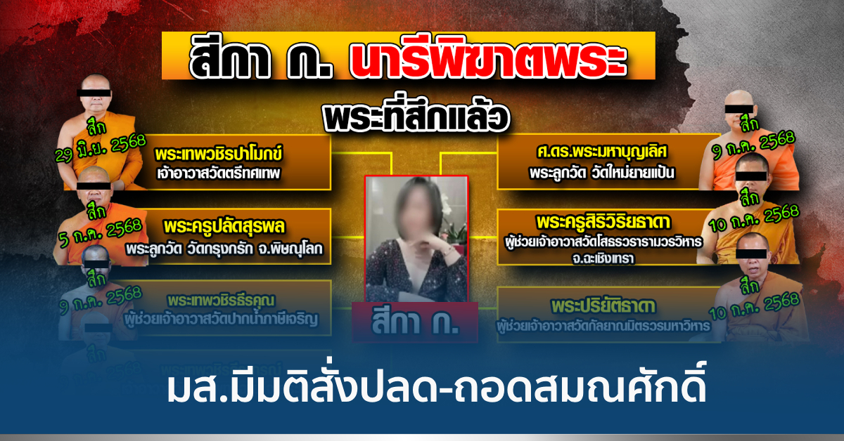 กรุงเทพฯ 13 ก.ค.-มหาเถรสมาคม ประชุมนัดพิเศษ มีมติสั่งปลด-ถอดสมณศักดิ์ พระอาบัติปาราชิก เผยสึกแล้ว 6 คน ยังติดต่อไม่ได้ 2 คน เตรียมแก้กฎมหาเถรสมาคม อ้างสุดล้าหลังกว่า 50 ปี ขณะที่พระเทพพัชราภรณ์ เจ้าอาวาสวัดชูจิตฯ ชิงลาออกแล้ว