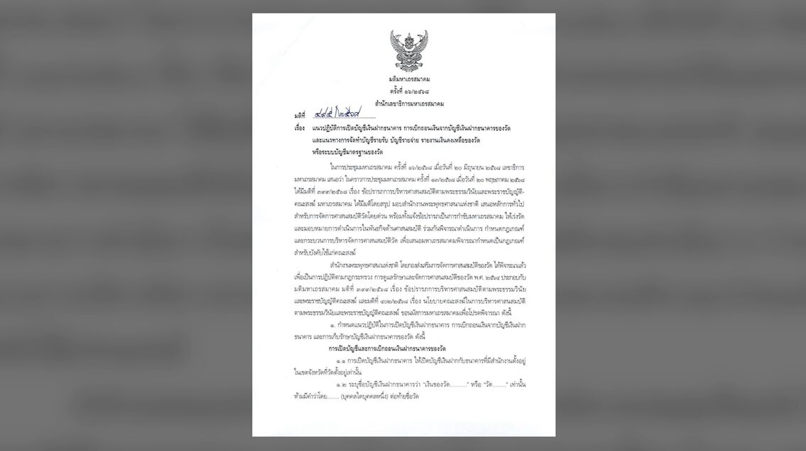 19 ก.ค.-สำนักงานพระพุทธศาสนาแห่งชาติ ออกหนังสือเวียน กำชับไปยังทุกวัดทั่วประเทศ เร่งจัดการบัญชีรายรับ-รายจ่าย ยึดตามมติ มส.