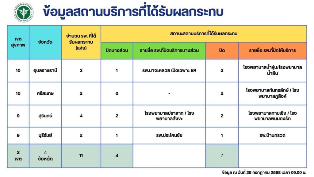 ก.สาธารณสุข 25 ก.ค. – สธ.ติดตามสถานการณ์ปะทะชายแดน สั่งการ 9 ข้อเน้นย้ำการช่วยเหลือผู้บาดเจ็บและผู้อพยพ โดยมีผู้ได้รับผลกระทบ 44 ราย เสียชีวิต 13 ราย อพยพผู้ป่วยในแล้ว 429 ราย และพลเรือน 83,170 ราย