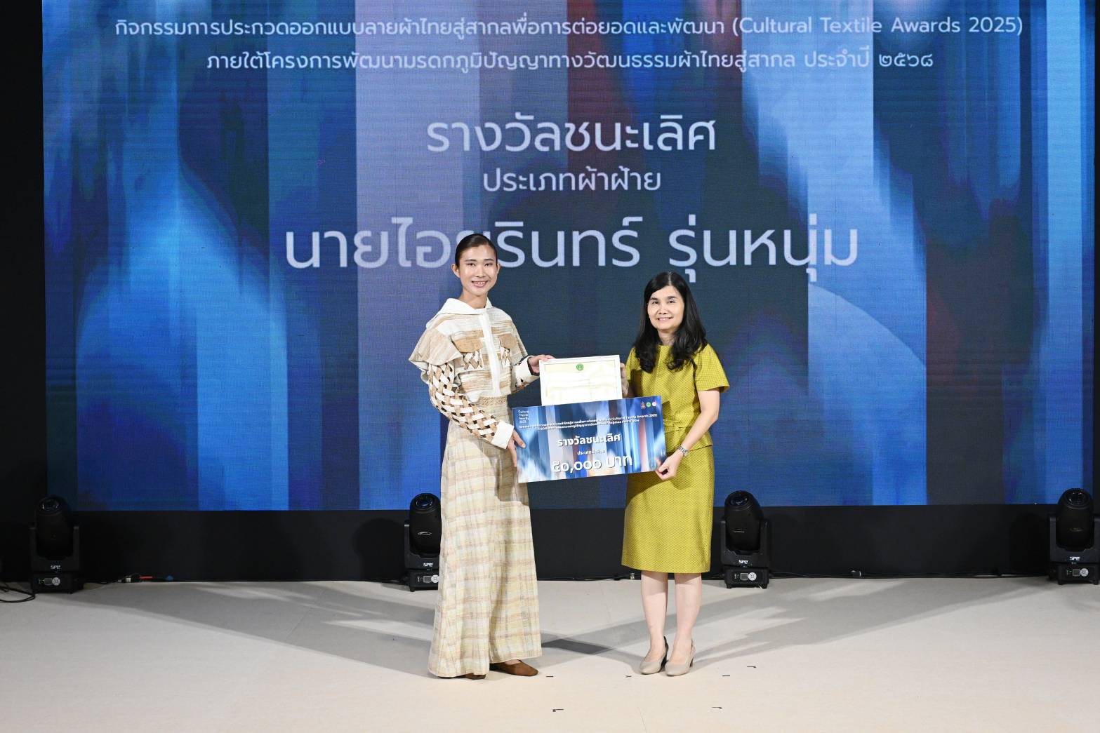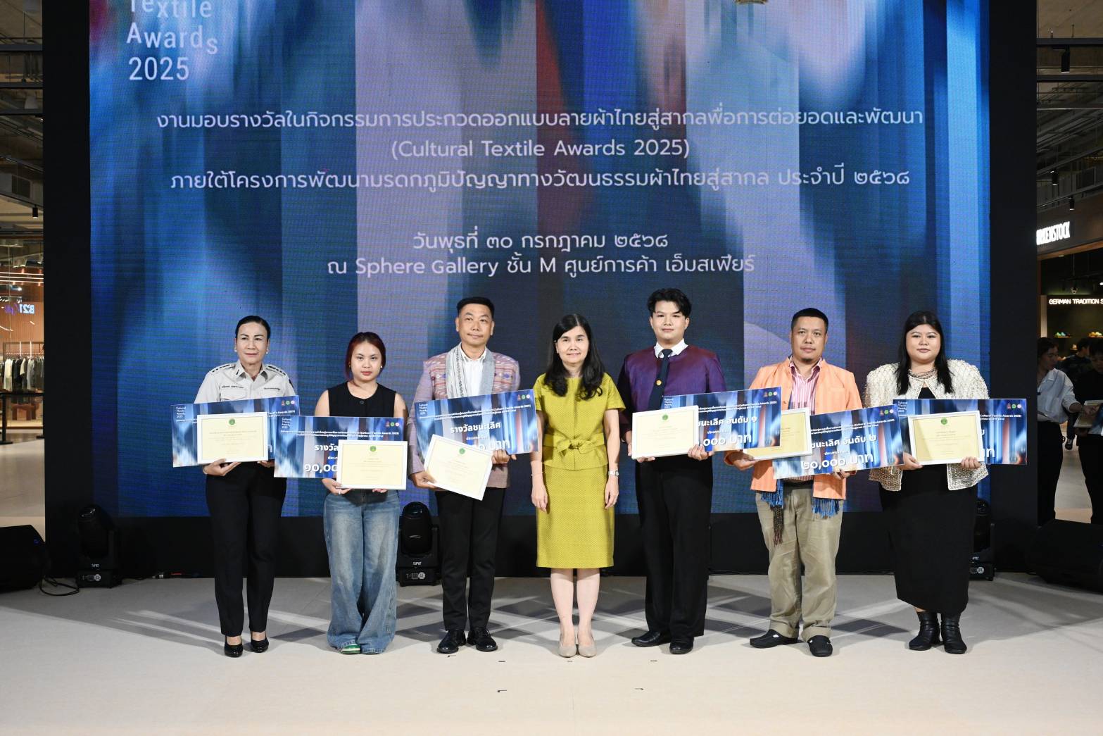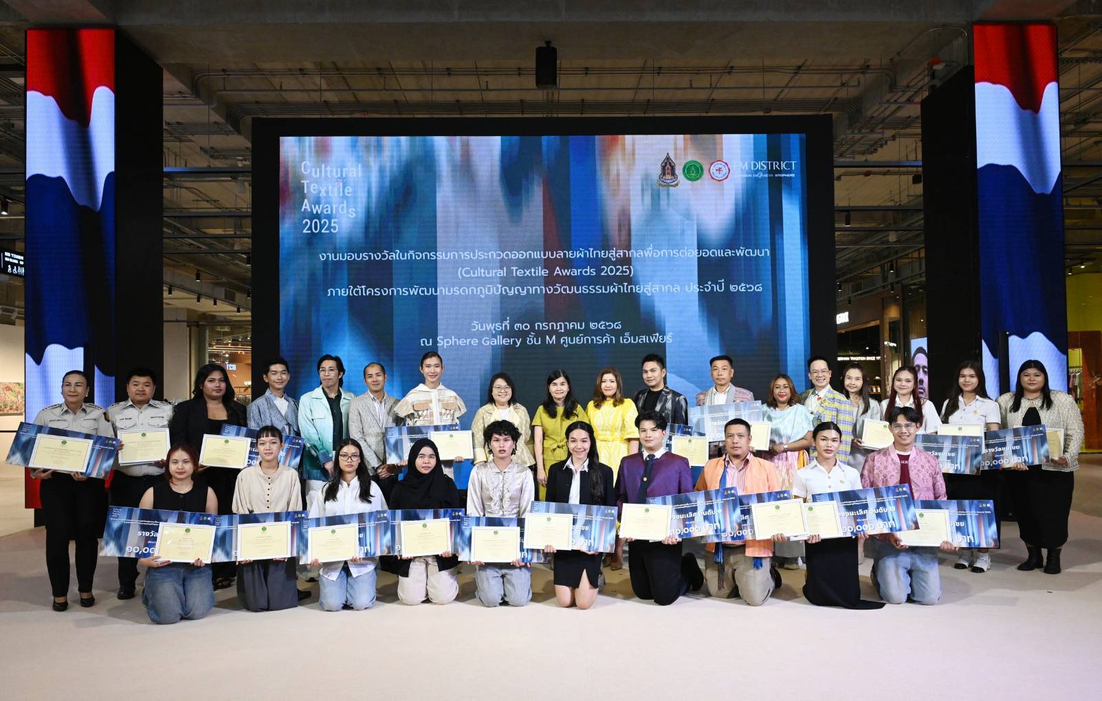 นางยุถิกา อิศรางกูร ณ อยุธยา อธิบดีกรมส่งเสริมวัฒนธรรม เป็นประธานในงานมอบรางวัลการประกวดออกแบบลายผ้าไทยสู่สากลเพื่อการต่อยอดและพัฒนา (Cultural Textile Awards 2025) ภายใต้โครงการพัฒนามรดกภูมิปัญญาทางวัฒนธรรมผ้าไทยสู่สากล ประจำปี 2568 ณ Sphere Gallery ชั้น M ศูนย์การค้า เอ็มสเฟียร์ กรุงเทพมหานคร โดยมี ดร. ปรารถนา คงสำราญ หัวหน้าโครงการพัฒนามรดกภูมิปัญญาทางวัฒนธรรมผ้าไทยสู่สากล ประจำปี 2568 นางสาวกิตติพร ใจบุญ ผู้เชี่ยวชาญด้านภูมิปัญญา ปฏิบัติหน้าที่ผู้อำนวยการกองมรดกภูมิปัญญาทางวัฒนธรรม นางสาวศิวพร ฉันทไกรวัฒน์ ผู้อำนวยการกลุ่มเผยแพร่และต่อยอดมรดกภูมิปัญญาทางวัฒนธรรม คณะกรรมการผู้ทรงคุณวุฒิ ผู้เชี่ยวชาญด้านมรดกภูมิปัญญาผ้าไทย ผู้ได้รับรางวัล สื่อมวลชน และแขกผู้มีเกียรติ เข้าร่วมงาน