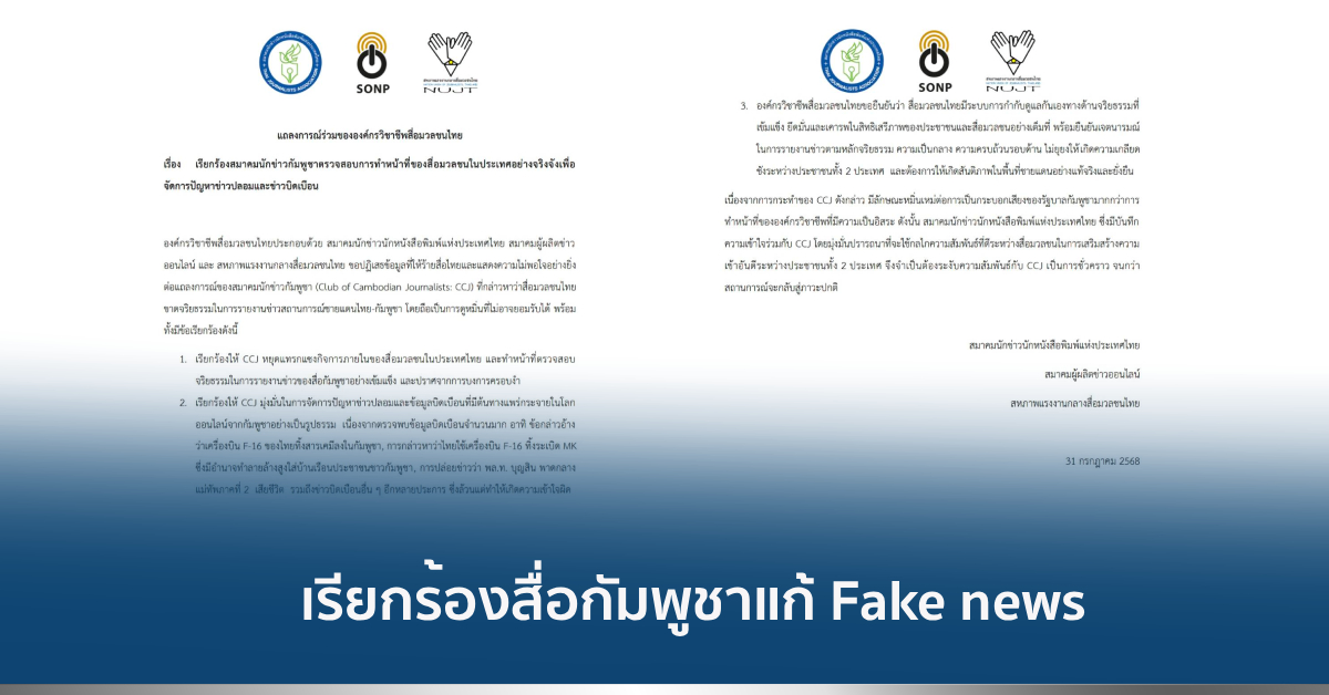 31 ก.ค.- องค์กรวิชาชีพสื่อมวลชนไทย ออกแถลงการณ์เรียกร้องสมาคมนักข่าวกัมพูชาตรวจสอบการทำหน้าที่ของสื่อมวลชนในประเทศอย่างจริงจัง เพื่อจัดการปัญหาข่าวปลอมและข่าวบิดเบือน