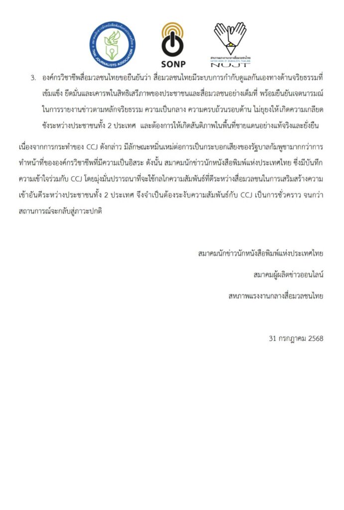 3.องค์กรวิชาชีพสื่อมวลชนไทยขอยืนยันว่า สื่อมวลชนไทยมีระบบการกำกับดูแลกันเองทางด้านจริยธรรมที่เข้มแข็ง ยึดมั่นและเคารพในสิทธิเสรีภาพของประชาชนและสื่อมวลชนอย่างเต็มที่ พร้อมยืนยันเจตนารมณ์ในการรายงานข่าวตามหลักจริยธรรม ความเป็นกลาง ความครบถ้วนรอบด้าน ไม่ยุยงให้เกิดความเกลียดชังระหว่างประชาชนทั้ง 2 ประเทศ และต้องการให้เกิดสันติภาพในพื้นที่ชายแดนอย่างแท้จริงและยั่งยืน