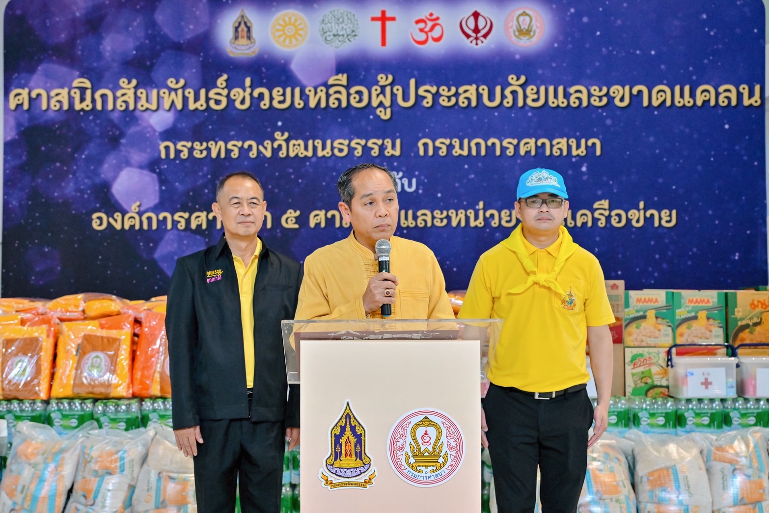 กระทรวงวัฒนธรรม โดยกรมการศาสนา ได้จัดพิธีมอบเครื่องอุปโภคบริโภค และของใช้ที่จำเป็น ช่วยเหลือผู้ประสบอุทกภัยจังหวัดน่าน ให้แก่ สำนักงานวัฒนธรรมจังหวัดน่าน สภาคริสตจักรในประเทศ ส่วนคริสตจักรที่ 5 จังหวัดน่าน และร่วมช่วยเหลือผู้ได้รับผลกระทบจากเหตุการณ์ความไม่สงบบริเวณชายแดนไทย-กัมพูชา ในจังหวัดสุรินทร์ ให้แก่ ศูนย์ปฏิบัติธรรมวัดกลางสุรินทร์ อำเภอเมืองสุรินทร์ ศาลากลางจังหวัดสุรินทร์ คริสตจักรพระกิตติคุณสังขะ อำเภอสังขะ และวัดสุทธิธรรมาราม วัดใหม่หลวงตาเยื้อน เพื่อช่วยเหลือบรรเทาความเดือดร้อนแก่ผู้นำศาสนา และศาสนิกชนผู้ประสบภัย เป็นการแสดงออกถึงความห่วงใยและเอื้ออาทรต่อกัน ถึงแม้อยู่ต่างพื้นที่ ต่างศาสนา หรือต่างความเชื่อ ในฐานะพี่น้องประชาชนคนไทยด้วยกัน ในการจัดพิธีเครื่องอุปโภคบริโภค และของใช้ที่จำเป็น ช่วยเหลือผู้ประสบอุทกภัยจังหวัดน่านและผู้ได้รับผลกระทบจากเหตุการณ์ความไม่สงบบริเวณชายแดนไทย-กัมพูชาในครั้งนี้ แสดงถึงความห่วงใยของภาครัฐ องค์การทางศาสนาทุกศาสนา และองค์กรเครือข่ายภาคเอกชนที่มีต่อประชาชนชาวไทย ซึ่งที่ผ่านมา องค์การทางศาสนาต่าง ๆ ในสังคมพหุวัฒนธรรม ได้ร่วมกันช่วยเหลือผู้ประสบภัยอย่างต่อเนื่องเป็นประจำทุกปี