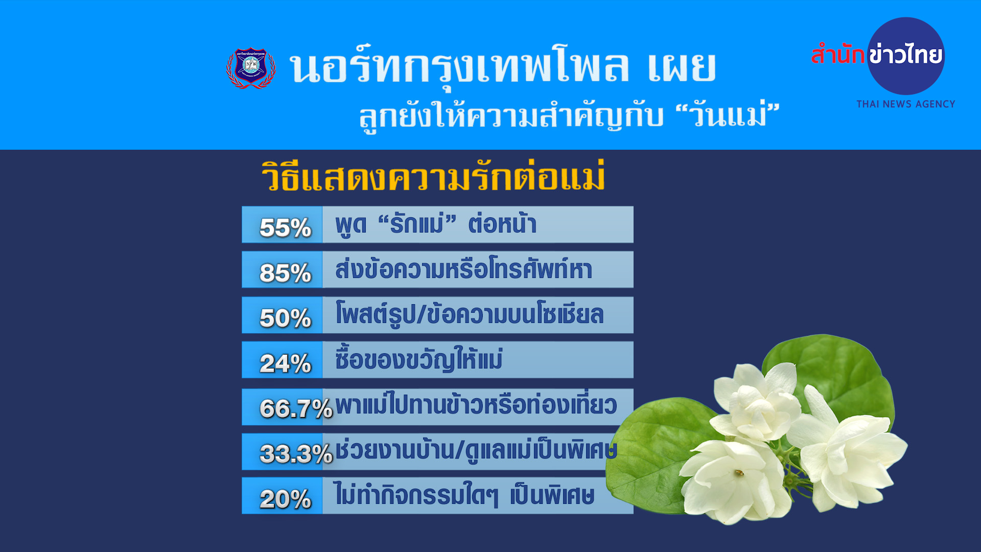 นอร์ทกรุงเทพโพล เผยผลสำรวจความคิดเห็นของประชาชนในหัวข้อ “มุมมองต่อวันแม่ในยุคปัจจุบัน” พบว่าคนไทยส่วนใหญ่ยังคงให้ความสำคัญกับวันแม่อย่างมากถึงร้อยละ 64 และค่อนข้างสำคัญร้อยละ 20 (รวมแล้วร้อยละ 84) นอกจากนี้ประชาชนส่วนใหญ่ร้อยละ 62 มองว่าคำว่า “แม่”ในสังคมปัจจุบันแม้จะเปลี่ยนไปจากอดีตบ้าง แต่สาระสำคัญโดยรวมยังคงเหมือนเดิม