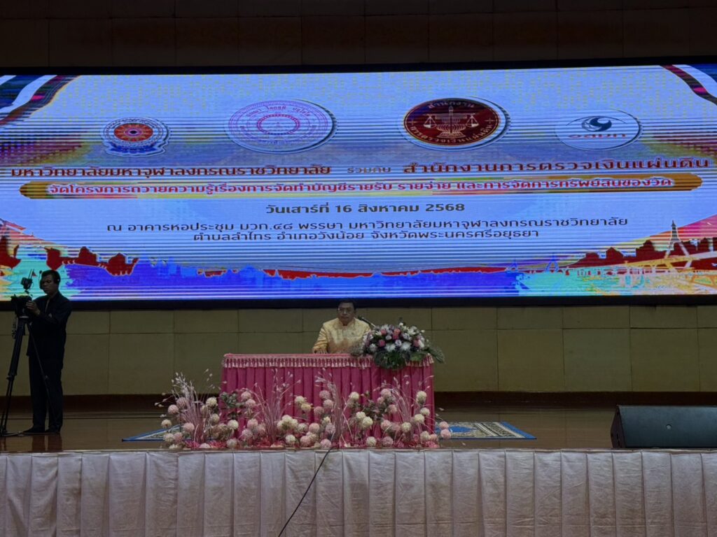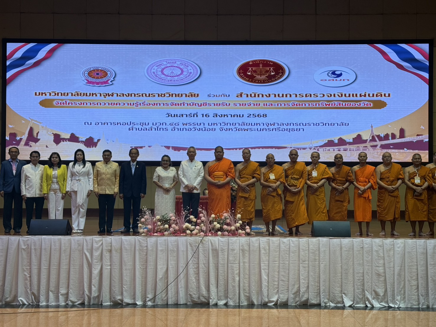 อยุธยา 16 ส.ค. – มหาวิทยาลัยมหาจุฬาลงกรณราชวิทยาลัย ร่วมกับสำนักงานการตรวจเงินแผ่นดิน สำนักงานพระพุทธศาสนา และบริษัท อสมท จำกัด (มหาชน) จัดโครงการ “ถวายความรู้เรื่องการจัดทำบัญชีรายรับ รายจ่าย และการจัดการทรัพย์สินของวัด” ที่มหาวิทยาลัยจุฬาลงกรณ์ราชวิทยาลัย อ.วังน้อย จ.พระนครศรีอยุธยา