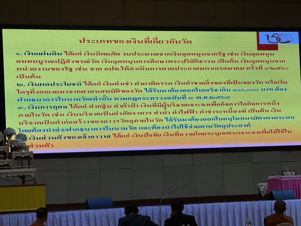 โดยมี พระพรหมวัชรธีราจารย์ ศ.ดร.อธิการบดีมหาวิทยาลัยมหาจุฬาลงกรณราชวิทยาลัย นายมณเทียร เจริญผล ผู้ว่าการตรวจเงินแผ่นดิน และนางกุลิสราพ์ บุญทับ รองผู้ว่าการตรวจเงินแผ่นดิน บรรยายพิเศษในหัวข้อ “การจัดทำบัญชีรายรับ รายจ่าย และการจัดการทรัพย์สินของวัด” ให้ความรู้ในเรื่องการจัดทำประมาณรายรับ-รายจ่ายของวัด, วิธีการรับและเก็บรักษาเงินของวัด, การควบคุมการจ่ายเงินของวัด, การจัดทำบัญชีรายรับ-รายจ่ายของวัด และการบริหารจัดการทรัพย์สินของวัดและการจัดซื้อจัดจ้าง โดยมีพระสังฆาธิการหรือผู้แทน จำนวน 200-250 รูป เข้าร่วม