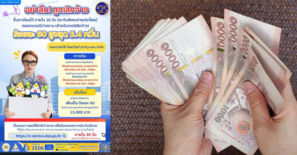 ก.แรงงาน 20 ส.ค. – ผู้ประกันตนมาตรา 33 ถูกเลิกจ้าง อย่าลืม! ขึ้นทะเบียนภายใน 30 วัน ประกันสังคมจ่ายประโยชน์ทดแทนให้ร้อยละ 60 รับสูงสุด 5.4 หมื่น