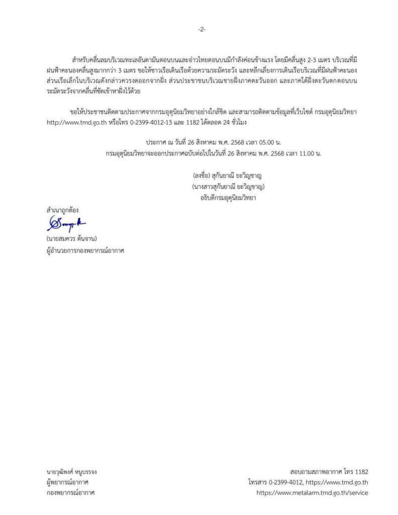 กรมอุตุนิยมวิทยาเตือนประชาชนในพื้นที่เสี่ยงโดยเฉพาะเชิงเขา ลุ่มน้ำ และใกล้ทางน้ำไหลผ่าน ให้ระวังน้ำท่วมฉับพลันและน้ำป่าไหลหลาก ขณะที่อ่าวไทยตอนบนและทะเลอันดามันตอนบนมีคลื่นสูง 2–3 เมตร บริเวณที่มีฝนฟ้าคะนองคลื่นสูงมากกว่า 3 เมตร ขอให้เรือเล็กงดออกจากฝั่ง ส่วนเรือใหญ่ให้เดินเรือด้วยความระมัดระวัง