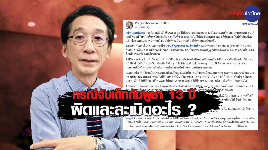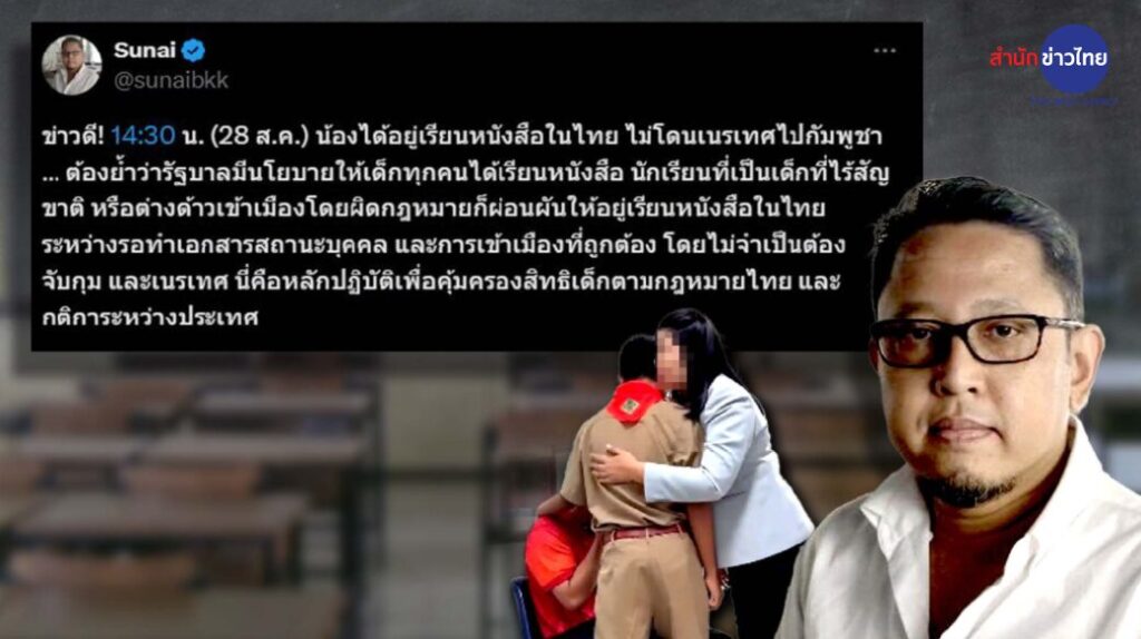 28 ส.ค. – อ.ปริญญา ชี้จับเด็ก 13 ส่งกลับกัมพูชาผิดอนุสัญญาสิทธิเด็ก ด้าน “สุนัย” ที่ปรึกษาองค์กรฮิวแมนไรท์ วอทช์ ประจำประเทศไทย โพสต์ล่าสุด ระบุน้องได้อยู่เรียนหนังสือในไทย ไม่โดนเนรเทศ