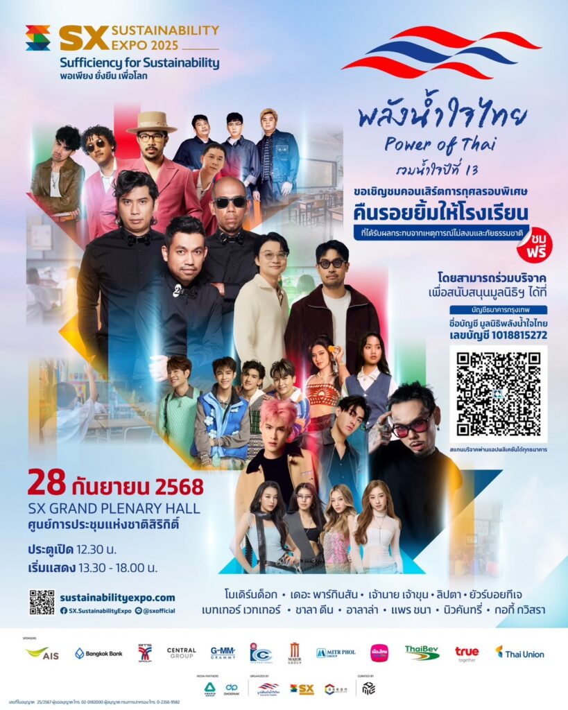 การจัดงานครั้งนี้ เกิดจากการผสานพลังน้ำใจไทยของ 12 องค์กรเอกชนชั้นนำ นำโดย บริษัท แอดวานซ์ อินโฟร์ เซอร์วิส จำกัด (มหาชน) ธนาคารกรุงเทพ จำกัด (มหาชน) บริษัท บีทีเอส กรุ๊ป โฮลดิ้งส์ จำกัด (มหาชน) กลุ่มเซ็นทรัล บริษัท จีเอ็มเอ็ม แกรมมี่ จำกัด (มหาชน) บริษัท ไอ.ซี.ซี.อินเตอร์เนชั่นแนล จำกัด (มหาชน) บริษัท เมเจอร์ ซีนีเพล็กซ์ กรุ้ป จำกัด (มหาชน) กลุ่มมิตรผล บริษัท เมืองไทยประกันชีวิต จำกัด (มหาชน) บริษัท ไทยเบฟเวอเรจ จำกัด (มหาชน) กลุ่มบริษัททรู และบริษัท ไทยยูเนี่ยน กรุ๊ป จำกัด (มหาชน) ร่วมกับภาคีเครือข่ายในวิกฤตอุทกภัยครั้งประวัติศาสตร์ในปี 2554 โดยมีวัตถุประสงค์เพื่อให้ความช่วยเหลือ และคืนรอยยิ้มให้โรงเรียนที่ได้รับผลกระทบจากเหตุการณ์ไม่สงบ และภัยธรรมชาติ ให้กลับมาทำการเรียนการสอนได้ตามปกติ และยังช่วยสนับสนุนส่งเสริมการศึกษาโรงเรียนในพื้นที่ห่างไกล โดยตลอดระยะเวลา 13 ปี ที่ผ่านมา มูลนิธิพลังน้ำใจไทยได้เข้าไปฟื้นฟู ช่วยเหลือโรงเรียนในรูปแบบต่าง ๆ ที่เกิดขึ้นโดยตลอดอย่างต่อเนื่อง ที่ยังรวมถึงคณะผู้จัดงาน Sustainability Expo 2025 (SX2025) และเครือข่ายพันธมิตร ที่จะเชิญชวนทุกท่านให้มาร่วมพลังน้ำใจไทยเป็นหนึ่งเดียวกันในครั้งนี้ เปิดให้ชมฟรี และสามารถร่วมชมการถ่ายทอดสดผ่านช่องทางออนไลน์ SX 2025 https://www.sustainabilityexpo.com/sx2025 และช่องทางสื่อออนไลน์ ของเครือข่ายพันธมิตร โดยผู้มีจิตศรัทธาสามารถร่วมบริจาคสมทบทุนได้ที่บัญชีธนาคารกรุงเทพ ชื่อบัญชี มูลนิธิพลังน้ำใจไทย เลขบัญชี 1018815272 .- สำนักข่าวไทย