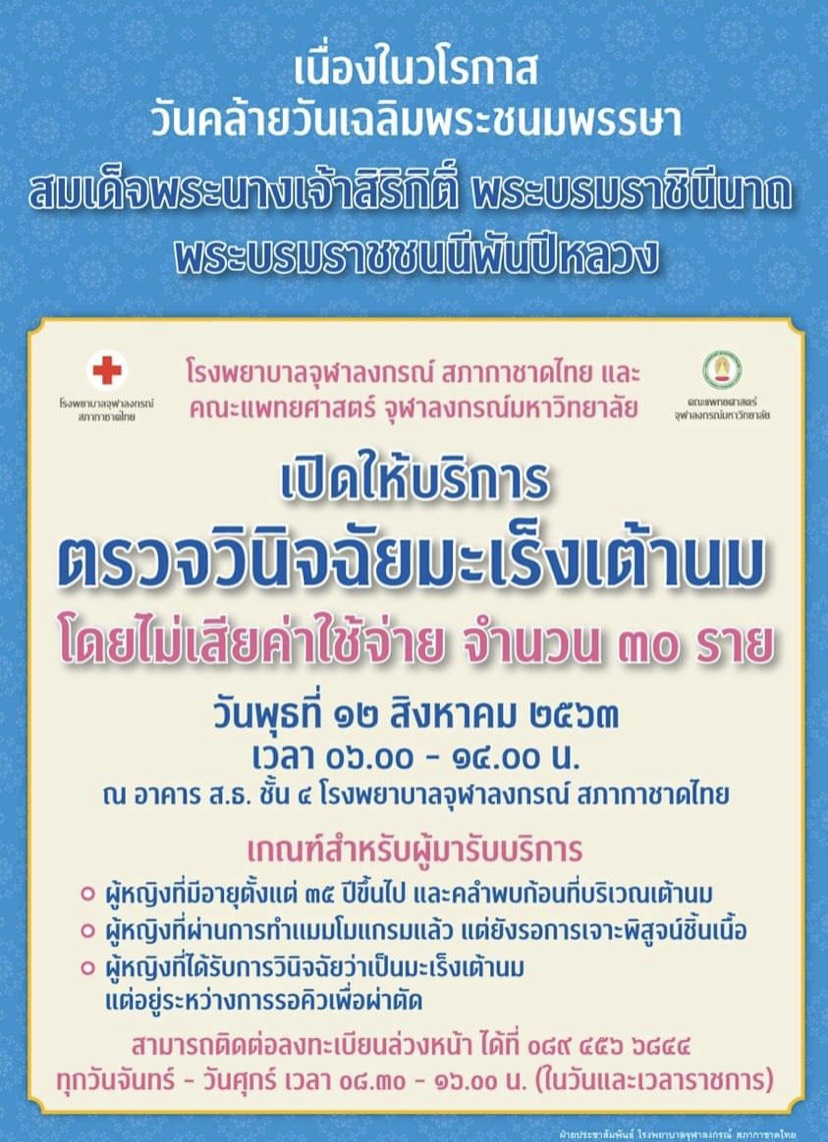 เนื่องในวโรกาสวันคล้ายวันเฉลิมพระชนมพรรษาสมเด็จพระนางเจ้าสิริกิติ์ พระบรมราชินีนาถ พระบรมราชชนนีพันปีหลวง และวันแม่แห่งชาติ ในวันที่ 12 สิงหาคม 2563 โรงพยาบาลจุฬาลงกรณ์ สภากาชาดไทย เปิดให้บริการตรวจวินิจฉัยมะเร็งเต้านม โดยไม่เสียค่าใช้จ่าย จำนวน 30 ราย โดยผู้รับบริการต้องลงทะเบียนล่วงหน้า และเป็นผู้มีเกณฑ์ดังต่อไปนี้