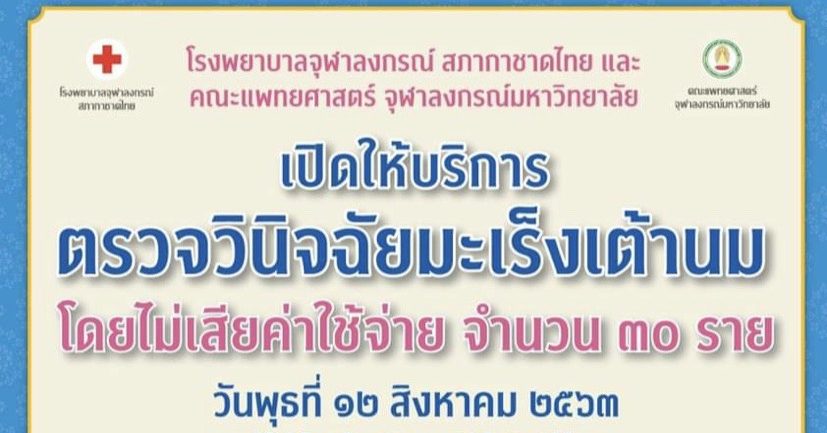 กรุงเทพฯ 1 ส.ค..-โรงพยาบาลจุฬาลงกรณ์ เปิดให้บริการตรวจวินิจฉัยมะเร็งเต้านม โดยไม่เสียค่าใช้จ่าย ในวันแม่แห่งชาติ