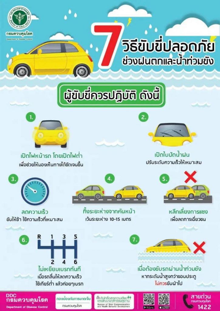 นายแพทย์สุวรรณชัย วัฒนายิ่งเจริญชัย อธิบดีกรมควบคุมโรค กล่าวว่า จากรายงานของกรมอุตุนิยมวิทยาคาดการณ์ว่า ในช่วงนี้ประเทศไทยจะมีฝนตกหนักถึงหนักมากบางพื้นที่ อาจทำให้เกิดน้ำท่วมขัง ซึ่งมีความเสี่ยงต่อการเกิดอุบัติเหตุทางถนนได้ นั้น กรมควบคุมโรค ขอให้ประชาชนที่ขับขี่ยานพาหนะบนท้องถนนในช่วงฝนตก ควรเพิ่มความระมัดระวัง โดยการตรวจสอบสถาพรถให้พร้อมใช้งาน เช่น ที่ปัดน้ำฝน หรือระบบไฟฟ้า และควรลดความเร็วลง ซึ่งในช่วงที่ฝนตกใน 10 นาทีแรก เป็นช่วงที่รถมีโอกาสลื่นไถลมากที่สุด เพราะน้ำฝนจะชะล้างคราบน้ำมันและฝุ่นละอองที่ติดอยู่บนพื้นถนน ทำให้เกิดเป็นเสมือนแผ่นฟิล์มอยู่บนผิวถนน ซึ่งอาจส่งผลให้รถลื่นและเสียหลักจนเกิดอุบัติเหตุได้ จึงต้องเพิ่มความระมัดระวังในการขับขี่เป็นพิเศษ