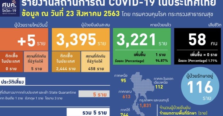 ข้อมูล ณ วันที่ 23 สิงหาคม 2563 โดย กรมควบคุมโรค กระทรวงสาธารณสุข ผู้ป่วยรายใหม่วันนี้ เพิ่มขึ้น 5ราย อยู่ในสถานที่กักกันที่รัฐจัดให้ มีผู้ป่วยยืนยันสะสม 3,395ราย หายป่วยแล้ว 3,221เสียชีวิต 58 คน