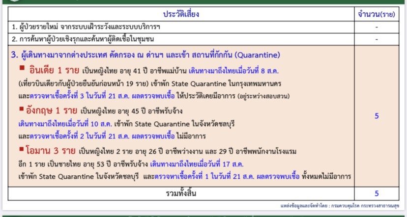 - อังกฤษ 1 ราย เป็นหญิงไทย อายุ 45 ปี อาชีพรับจ้าง เดินทางมาถึงไทยเมื่อวันที่ 10 ส.ค. เข้าพัก State Quarantine ในจังหวัดชลบุรี และตรวจหาเชื้อครั้งที่ 2 ในวันที่ 21 ส.ค. ผลตรวจพบเชื้อ ไม่มีอาการ