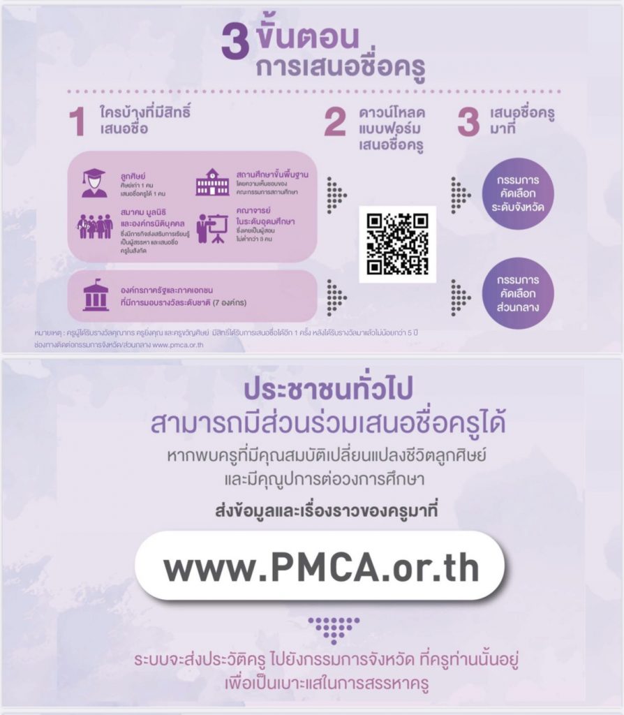 นายสมคิด จันทมฤก รองปลัดกระทรวงมหาดไทย กล่าวว่า กลไกของคณะกรรมการคัดเลือกระดับจังหวัด ซึ่งมาจากหน่วยงานภาครัฐ ภาควิชาการ ภาคประชาสังคม และภาคสื่อมวลชน ร่วมกันค้นหาครูที่มีจิตวิญญาณในการเปลี่ยนแปลงชีวิตลูกศิษย์และมีคุณูปการต่อวงการศึกษา จึงขอเชิญชวนร่วมกันส่งรายชื่อครูมาที่คณะกรรมการคัดเลือกระดับจังหวัด และเป็นปีแรกที่เปิดโอกาสให้ประชาชนทั่วไปสามารถมีส่วนร่วมในการเสนอชื่อได้ โดยส่งเรื่องราวของครูมาที่ www.PMCA.or.th
