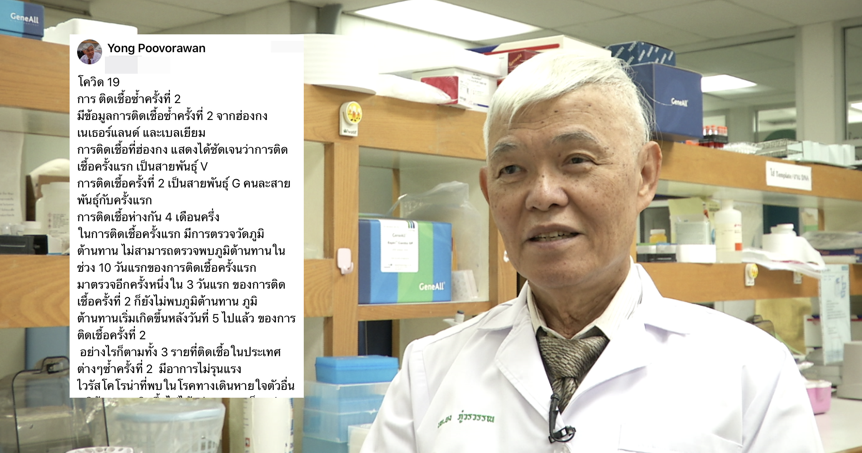 ศ.นพ.ยง ภู่วรวรรณ หัวหน้าศูนย์เชี่ยวชาญเฉพาะทางด้านไวรัสวิทยาคลินิก ภาควิชากุมารเวชศาสตร์ คณะแพทยศาสตร์ จุฬาลงกรณ์มหาวิทยาลัย โพสต์ผ่านเฟซบุ๊ก เรื่อง “โควิด-19 การติดเชื้อซ้ำครั้งที่ 2” โดยระบุว่า มีข้อมูลการติดเชื้อซ้ำครั้งที่ 2 จากฮ่องกง เนเธอร์แลนด์ และเบลเยียม การติดเชื้อที่ฮ่องกงแสดงได้ชัดเจนว่าการติดเชื้อครั้งแรก เป็น สายพันธุ์ V การติดเชื้อครั้งที่ 2 เป็นสายพันธุ์ G คนละสายพันธุ์กับครั้งแรก