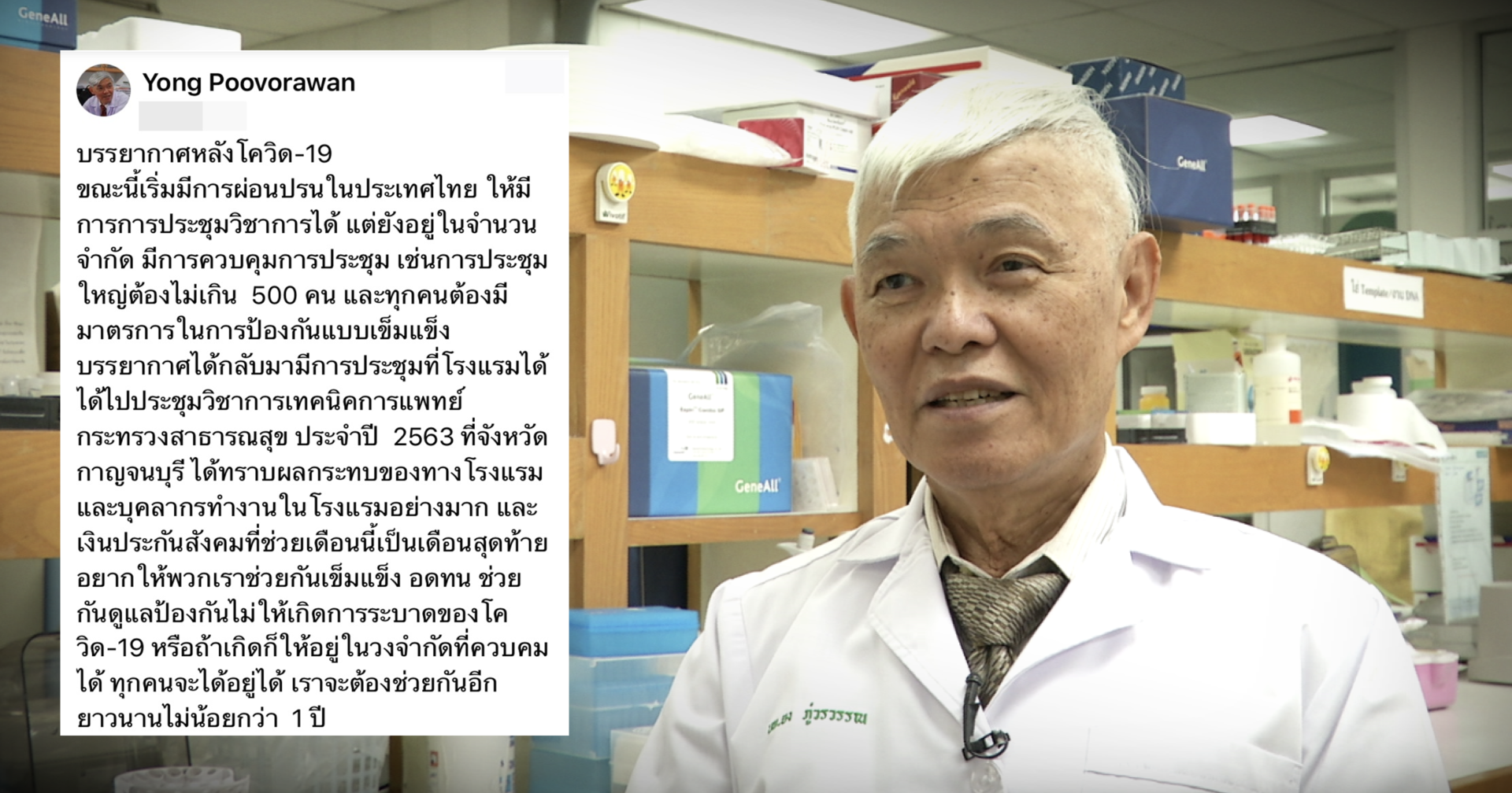 ศ.นพ.ยง ภู่วรวรรณ หัวหน้าศูนย์เชี่ยวชาญเฉพาะทางด้านไวรัสวิทยาคลินิก ภาควิชากุมารเวชศาสตร์ คณะแพทยศาสตร์ จุฬาลงกรณ์มหาวิทยาลัย โพสต์ผ่านเฟซบุ๊ก Yong Poovorawan ว่า บรรยากาศหลังโควิด-19 ขณะนี้เริ่มมีการผ่อนปรนในประเทศไทย ให้มีการการประชุมวิชาการได้ แต่ยังอยู่ในจำนวนจำกัด มีการควบคุมการประชุม เช่นการประชุมใหญ่ต้องไม่เกิน 500 คน และทุกคนต้องมีมาตรการในการป้องกันแบบเข็มแข็ง