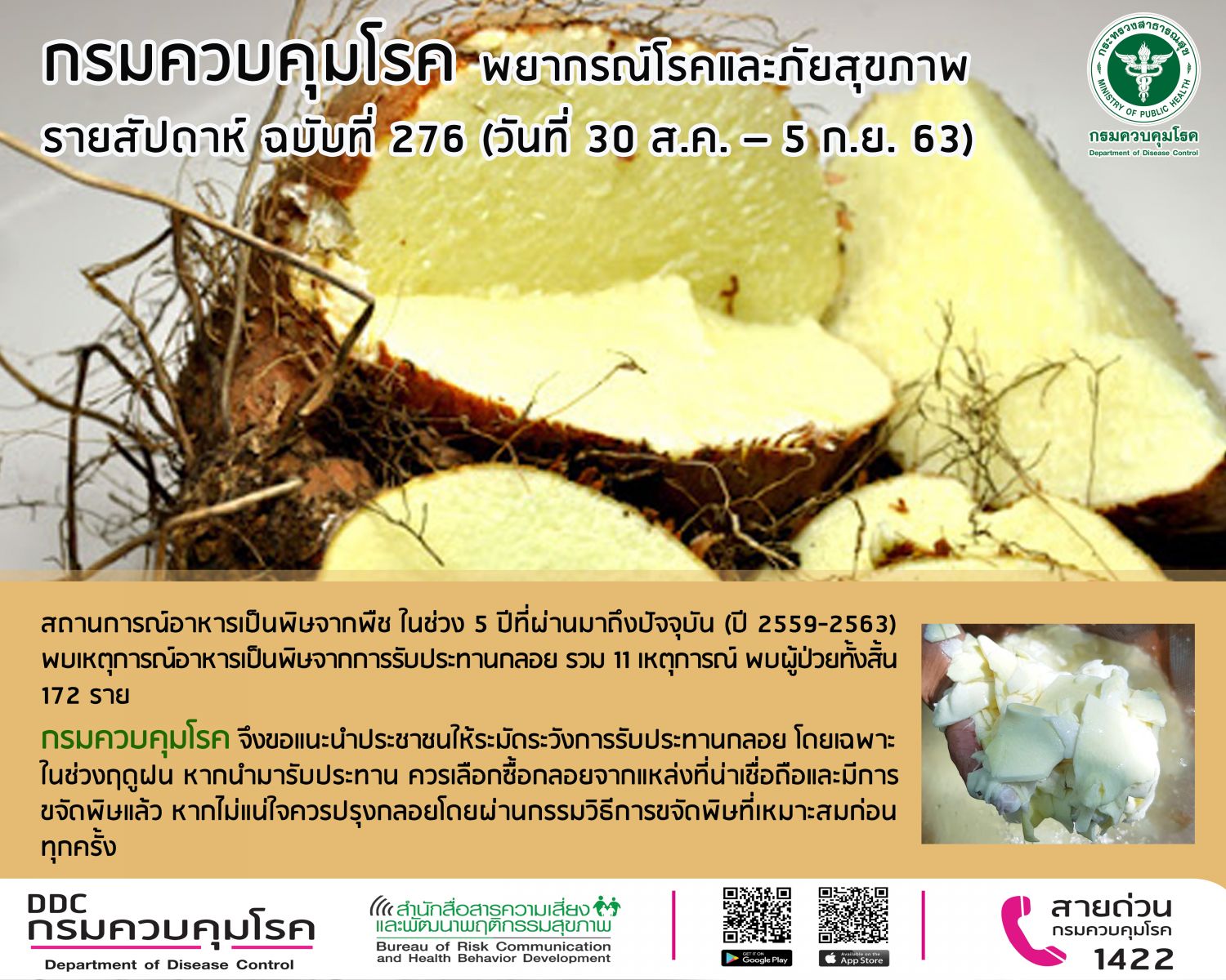 กรมควบคุมโรค เผยแพร่ “พยากรณ์โรคและภัยสุขภาพรายสัปดาห์” ฉบับที่ 276 ประจำสัปดาห์ที่ 35 (วันที่ 30 ส.ค.–5 ก.ย. 63) โดยนพ.สุวรรณชัย วัฒนายิ่งเจริญชัย อธิบดีกรมควบคุมโรค ว่า “จากการเฝ้าระวังของกรมควบคุมโรค สถานการณ์อาหารเป็นพิษจากพืช ในช่วง 5 ปีที่ผ่านมาถึงปัจจุบัน (ปี 2559-2563) พบเหตุการณ์อาหารเป็นพิษจากการรับประทานกลอย รวม 11 เหตุการณ์ พบผู้ป่วยทั้งสิ้น 172 ราย (ผู้ป่วยในเหตุการณ์อยู่ระหว่าง 3-32 ราย) เสียชีวิต 2 ราย ผู้ป่วยมีอาการรุนแรงเข้ารับการรักษาในโรงพยาบาล 36 ราย เหตุการณ์ส่วนใหญ่เกิดในเดือนสิงหาคม รองลงมาคือธันวาคม กันยายน และ มีนาคม