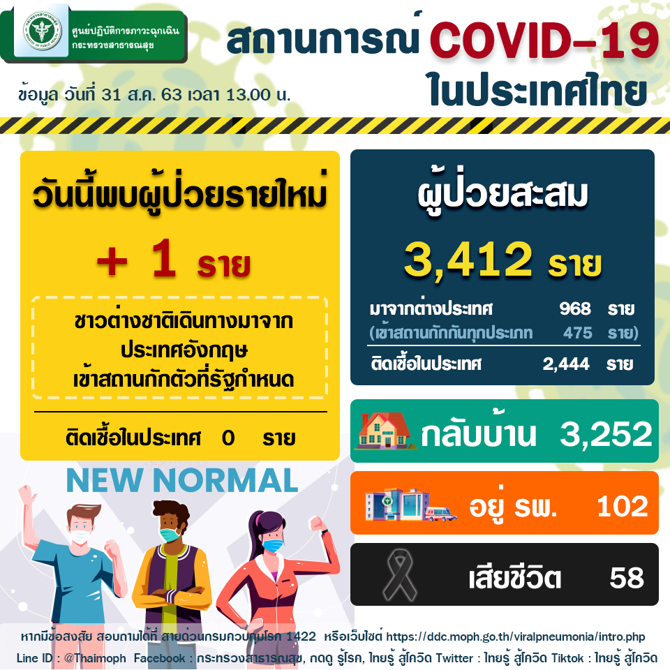 กระทรวงสาธารณสุข (สธ.) รายงานข่าวกรณีโรคติดเชื้อไวรัสโคโรนา 2019 (COVID-19) ประจำวันที่ 31 สิงหาคม 2563 ว่า สถานการณ์ผู้ติดเชื้อไวรัสโคโรนา 2019 ในประเทศไทยวันนี้ มีผู้ติดเชื้อรายใหม่ 1 ราย เป็นผู้ที่เดินทางต่างประเทศ (อังกฤษ) และเข้ารับการเฝ้าระวังกักตัวในสถานที่รัฐจัดให้ ไม่มีผู้ป่วยกลับบ้านเพิ่ม มีผู้ป่วยกลับบ้านสะสม 3,252 ราย หรือคิดเป็นร้อยละ 95.31 ของผู้ป่วยทั้งหมด มีผู้ป่วยที่ยังรักษาอยู่ในโรงพยาบาล 102 ราย หรือร้อยละ 2.99 ของผู้ป่วยทั้งหมด ไม่มีผู้เสียชีวิตเพิ่ม รวมผู้เสียชีวิตสะสม 58 ราย ผู้ป่วยสะสมทั้งสิ้น 3,412 ราย