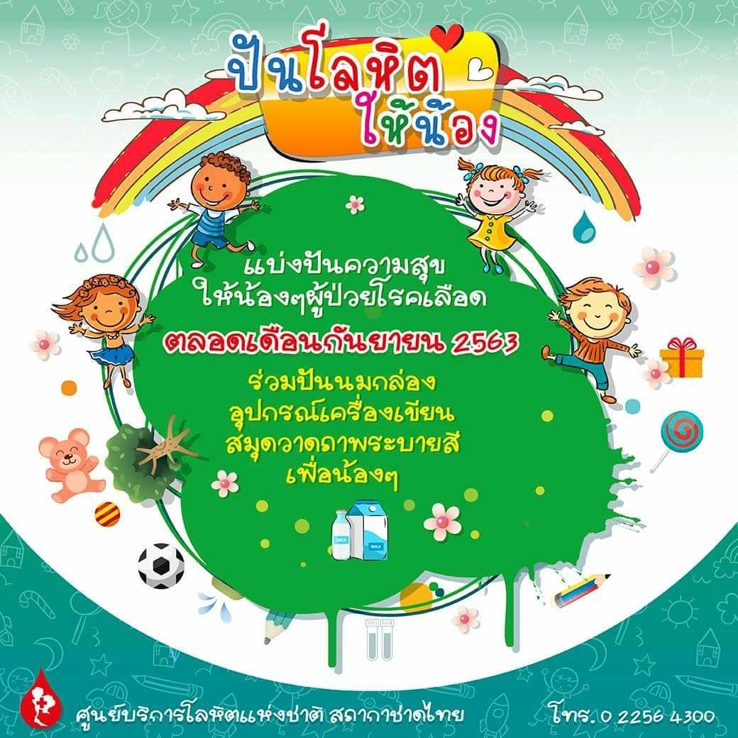 จึงขอเชิญชวนร่วมเป็นส่วนหนึ่งแบ่งปันความสุขให้กับผู้ป่วยเด็กโรคเลือดกว่า 1 หมื่นราย บริจาคโลหิต และบริจาคอุปกรณ์เครื่องเขียน สมุดวาดภาพระบายสี และนมกล่อง เพื่อนำไปมอบเป็นกำลังใจให้น้องๆในโรงพยาบาลสาขาบริการโลหิต ในโครงการ“ปันโลหิตให้น้อง” ตลอดเดือนกันยายน 2563 ณ ศูนย์บริการโลหิตแห่งชาติ และภาคบริการโลหิตแห่งชาติ 12 แห่งทั่วประเทศ ได้แก่ จ.ลพบุรี ชลบุรี ราชบุรี นครราชสีมา ขอนแก่น อุบลราชธานี นครสวรรค์ พิษณุโลก เชียงใหม่ นครศรีธรรมราช (ทุ่งสง) สงขลา และภูเก็ต .-สำนักข่าวไทย