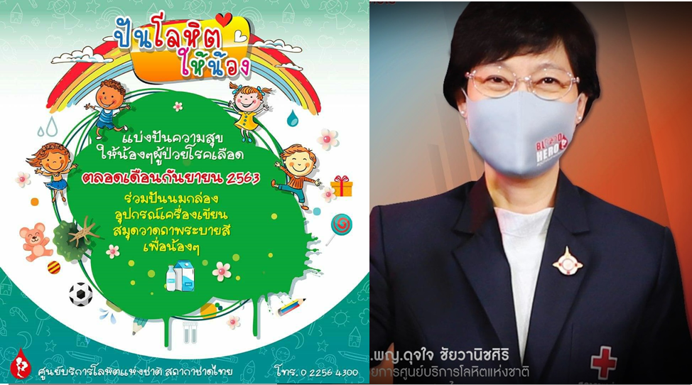 กทม.1 ก.ย.-ศูนย์บริการโลหิตแห่งชาติ สภากาชาดไทย ชวนร่วมแบ่งปันความสุขบริจาคโลหิต ช่วยผู้ป่วยเด็กโรคเลือดกว่า 1 หมื่นราย ในโครงการ “ปันโลหิตให้น้อง” ตลอดเดือน ก.ย.63 ณ ศูนย์บริการโลหิตแห่งชาติ และภาคบริการโลหิตแห่งชาติ 12 แห่งทั่วประเทศ
