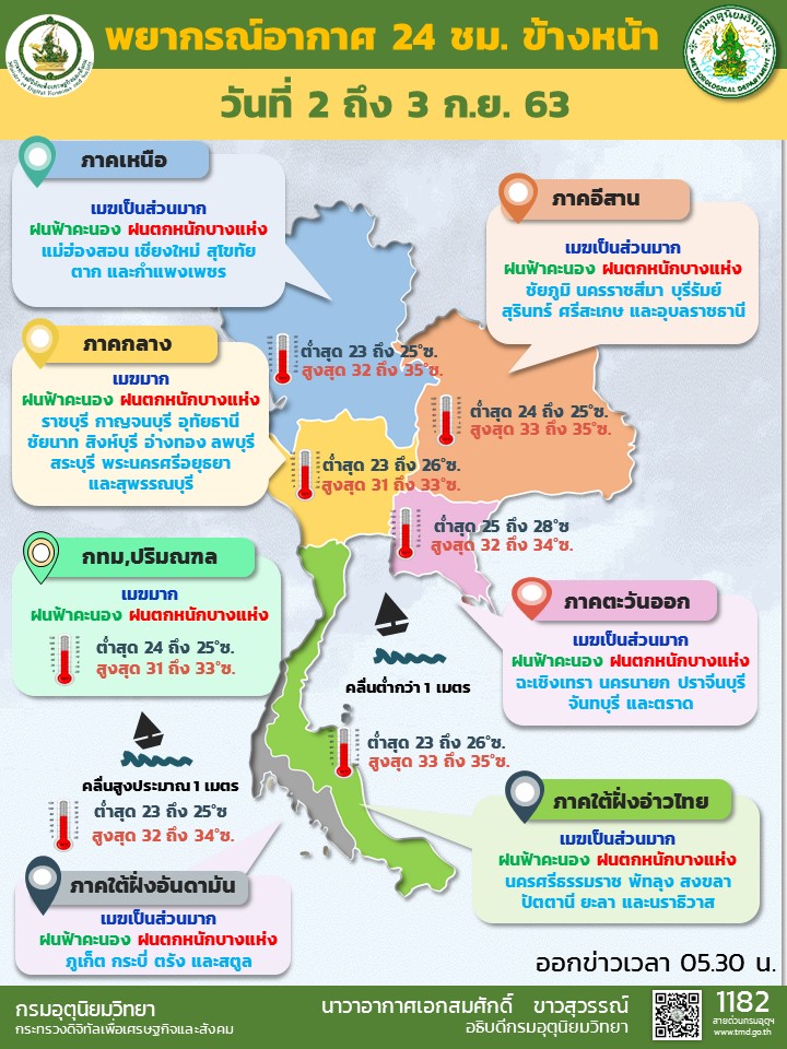 กรมอุตุนิยมวิทยา พยากรณ์อากาศ 24 ชั่วโมงข้างหน้า ประเทศไทยยังคงมีฝนตกต่อเนื่อง กับมีฝนตกหนักบางแห่ง เนื่องจากร่องมรสุมกำลังแรงพาดผ่านภาคเหนือตอนล่าง ภาคกลาง และภาคตะวันออกเฉียงเหนือ ประกอบกับมรสุมตะวันตกเฉียงใต้พัดปกคลุมทะเลอันดามัน ประเทศไทย และอ่าวไทย ขอให้ประชาชนบริเวณพื้นที่เสี่ยงภัย ในภาคเหนือตอนล่าง ภาคตะวันออกเฉียงเหนือ ภาคกลาง ภาคตะวันออก และภาคใต้ ระวังอันตรายจากฝนที่ตกหนัก ซึ่งอาจทำให้เกิดน้ำท่วมฉับพลัน น้ำป่าไหลหลากได้
