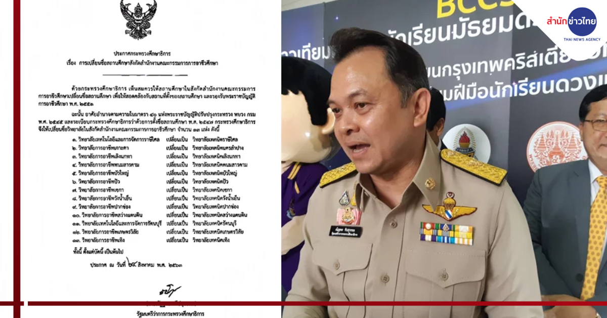 ศธ. 2 ก.ย.-กระทรวงศึกษาฯ ออกประกาศเปลี่ยนชื่อสถานศึกษา สังกัดสำนักงานคณะกรรมการการอาชีวศึกษา 13 แห่ง เพื่อให้สอดคล้องกับสถานที่ตั้งของสถานศึกษา และรองรับ พ.ร.บ.การอาชีวศึกษา พ.ศ.2551