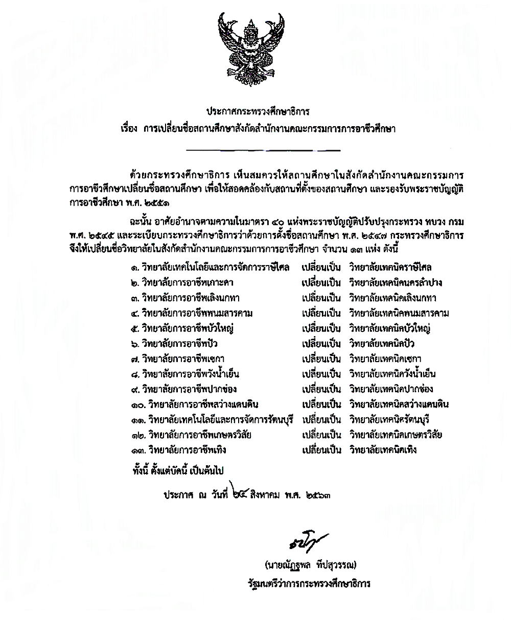 นายณัฏฐพล ทีปสุวรรณ รัฐมนตรีว่าการกระทรวงศึกษาธิการ ลงนามในประกาศกระทรวงศึกษาธิการ ลงวันที่ 24 สิงหาคม 2563 เรื่อง การเปลี่ยนชื่อสถานศึกษา สังกัดสำนักงานคณะกรรมการการอาชีวศึกษา โดยมีรายละเอียดว่า