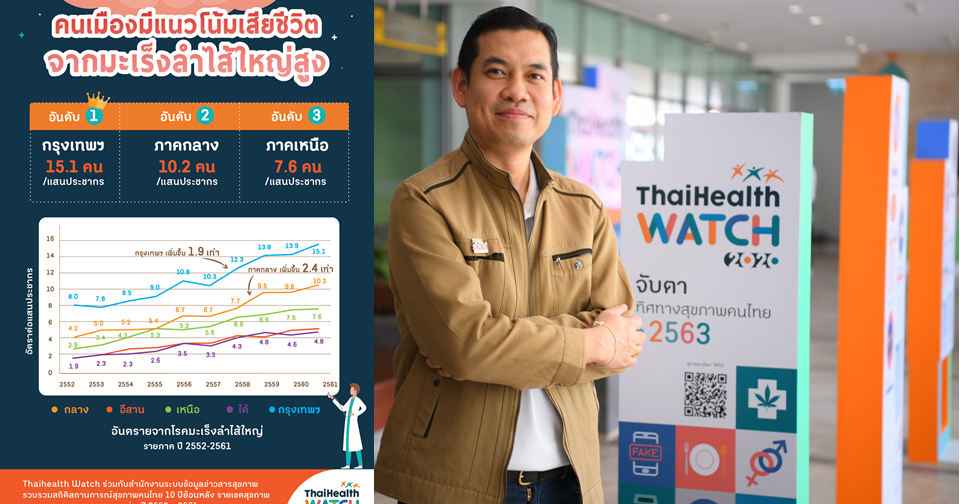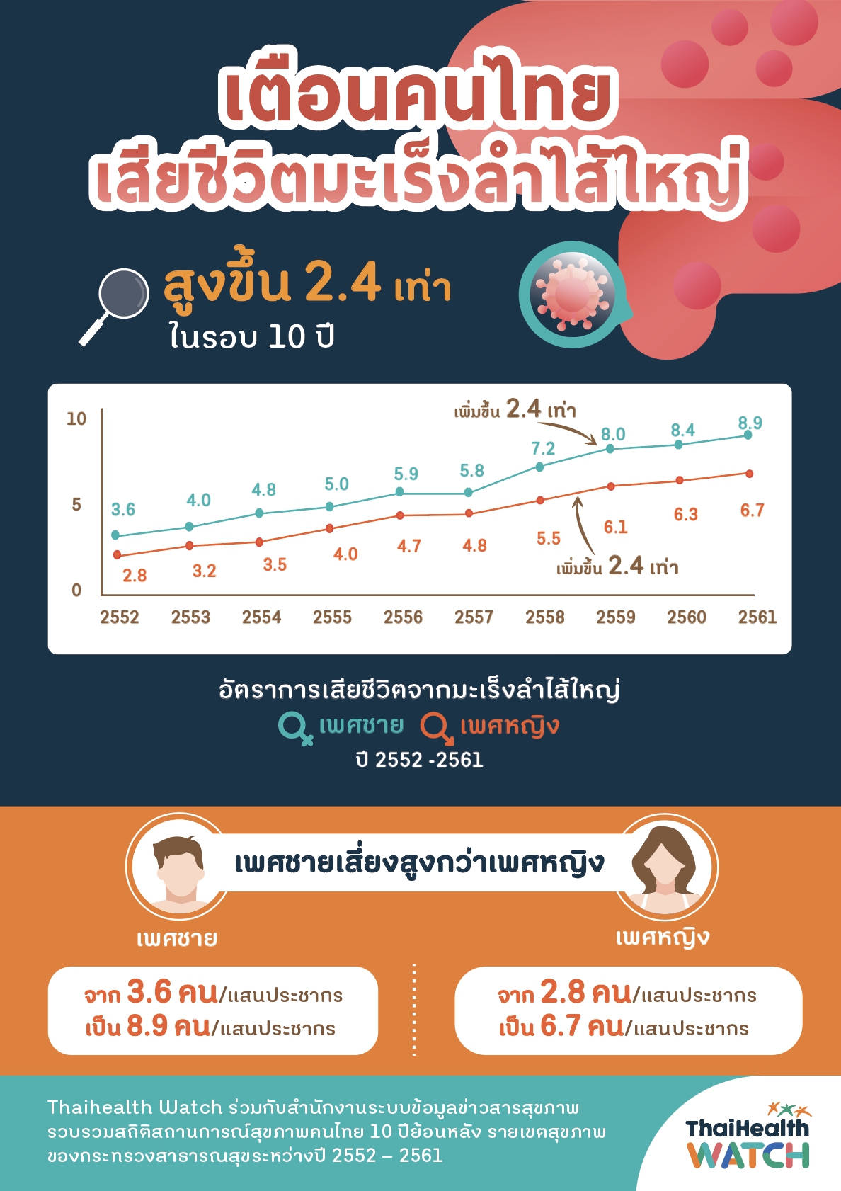 ดร.นพ.ไพโรจน์ เสาน่วม ผู้ช่วยผู้จัดการกองทุนสนับสนุนการสร้างเสริมสุขภาพ (สสส.) และผู้อำนวยการสำนักส่งเสริมวิถีชีวิตสุขภาวะ สสส. กล่าวว่า จากข้อมูลของรายงานจับตาพฤติกรรมสุขภาพคนไทย หรือ ThaiHealth Watch ร่วมกับ สำนักงานระบบข้อมูลข่าวสารสุขภาพ รวบรวมสถิติสถานการณ์สุขภาพคนไทย 10 ปีย้อนหลังรายเขตสุขภาพ ระหว่าง พ.ศ. 2552–2561 พบว่า คนไทยมีแนวโน้มเสียชีวิตด้วยโรคมะเร็งลำไส้ใหญ่สูงขึ้น 2.4 เท่าทั้งเพศหญิงและชาย โดยในปี 2552 อัตราการเสียชีวิตจากมะเร็งลำไส้ใหญ่ในเพศชาย อยู่ที่ 3.6 คนต่อแสนประชากร เพิ่มขึ้นเป็น 8.9 คนต่อแสนประชากรในปี 2561 เช่นเดียวกับเพศหญิง ในปี 2552 อยู่ที่ 2.8 คนต่อแสนประชากร เพิ่มขึ้นเป็น 6.7 คนต่อแสนประชากรในปี 2561