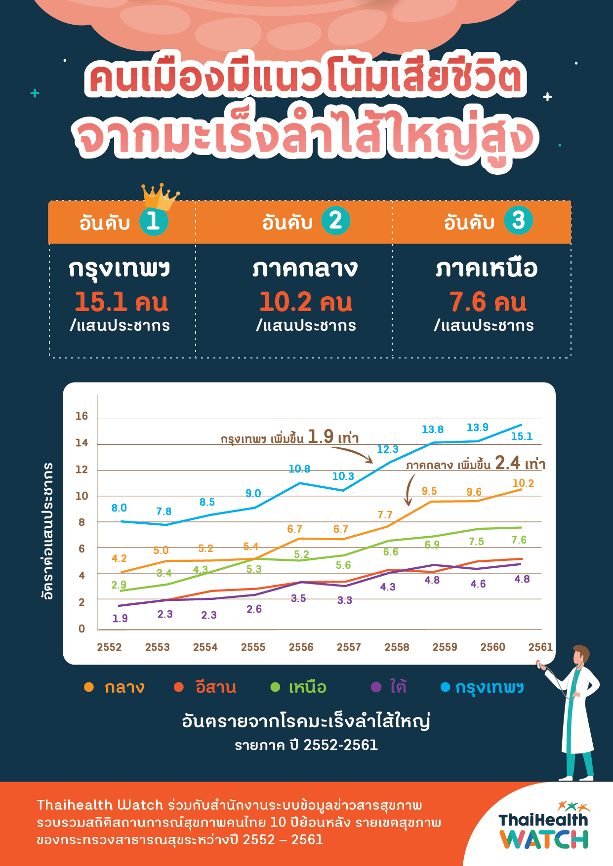 ที่น่าสนใจคือคนในเขตเมืองมีแนวโน้มเสียชีวิตจากมะเร็งลำไส้สูงขึ้น โดยเฉพาะในเขต กทม. ที่มีจำนวนมากที่สุด 15.1 คนต่อแสนประชากร ซึ่งมีอัตราการเสียชีวิตเพิ่มขึ้น 1.9 เท่าในรอบ 10 ปี ตามด้วยภาคกลาง 10.2 คนต่อแสนประชากร ซึ่งมีอัตราการเสียชีวิตเพิ่มขึ้น 2.4 เท่า