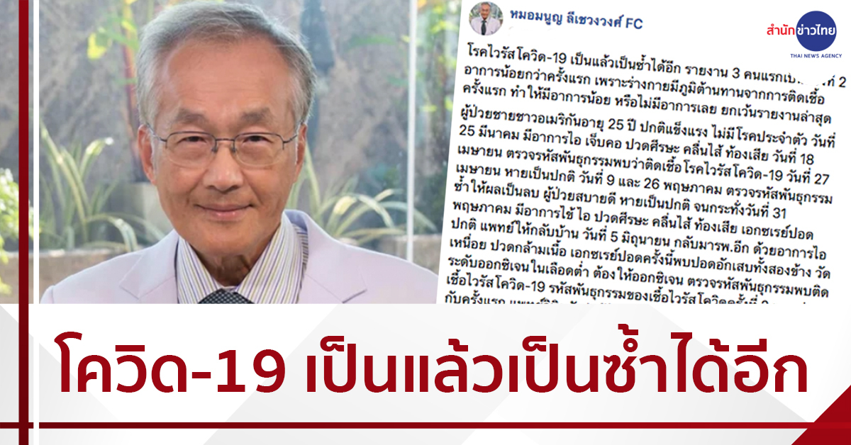 นพ.มนูญ ลีเชวงวงศ์ แพทย์เฉพาะทางด้านโรคระบบการหายใจผู้ป่วยหนักและโรคผู้สูงอายุ โรงพยาบาลวิชัยยุทธและประธานชมรมเชื้อราทางการแพทย์ประเทศไทย โพสต์ผ่านเพจเฟซบุ๊ก “หมอมนูญ ลีเชวงวงศ์ FC” วันนี้ (4ก.ย.) ว่า โรคไวรัสโควิด-19 เป็นแล้วเป็นซ้ำได้อีก รายงาน 3 คนแรกเป็นครั้งที่ 2 อาการน้อยกว่าครั้งแรก เพราะร่างกายมีภูมิต้านทานจากการติดเชื้อครั้งแรก ทำให้มีอาการน้อย หรือไม่มีอาการเลย ยกเว้นรายงานล่าสุด