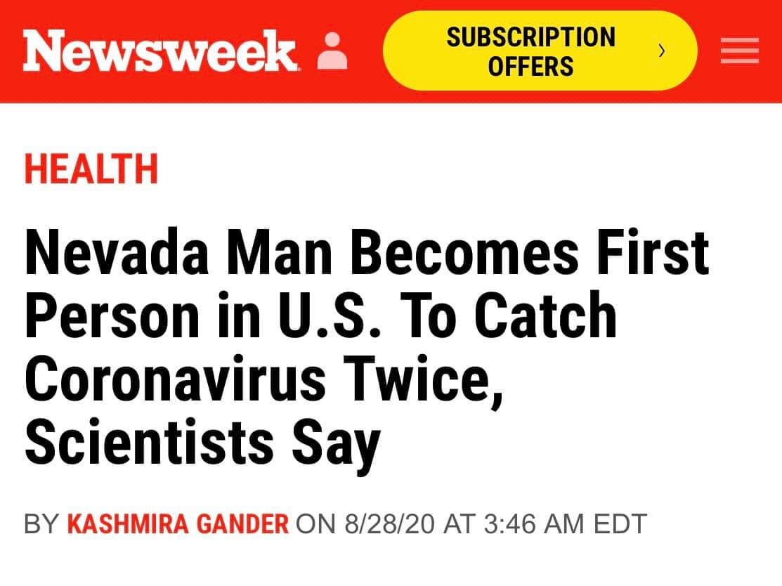 ผู้ป่วยชายชาวอเมริกันอายุ 25 ปี ปกติแข็งแรง ไม่มีโรคประจำตัว วันที่ 25 มีนาคม มีอาการไอ เจ็บคอ ปวดศีรษะ คลื่นไส้ ท้องเสีย วันที่ 18 เมษายน ตรวจรหัสพันธุกรรมพบว่าติดเชื้อโรคไวรัสโควิด-19 วันที่ 27 เมษายน หายเป็นปกติ วันที่ 9 และ 26 พฤษภาคม ตรวจรหัสพันธุกรรมซ้ำให้ผลเป็นลบ ผู้ป่วยสบายดี หายเป็นปกติ จนกระทั่งวันที่ 31 พฤษภาคม มีอาการไข้ ไอ ปวดศีรษะ คลื่นไส้ ท้องเสีย เอกซเรย์ปอดปกติ แพทย์ให้กลับบ้าน วันที่ 5 มิถุนายน กลับมา รพ.อีก ด้วยอาการไอ เหนื่อย ปวดกล้ามเนื้อ เอกซเรย์ปอดครั้งนี้พบปอดอักเสบทั้งสองข้าง วัดระดับออกซิเจนในเลือดต่ำ ต้องให้ออกซิเจน ตรวจรหัสพันธุกรรมพบติดเชื้อไวรัสโควิด-19 รหัสพันธุกรรมของเชื้อไวรัสโควิดครั้งที่ 2 แตกต่างกับครั้งแรก แพทย์วินิจฉัยว่าผู้ป่วยรายนี้ติดเชื้อไวรัสโควิด-19 ครั้งที่ 2 ห่างจากการติดเชื้อครั้งแรก 48 วัน