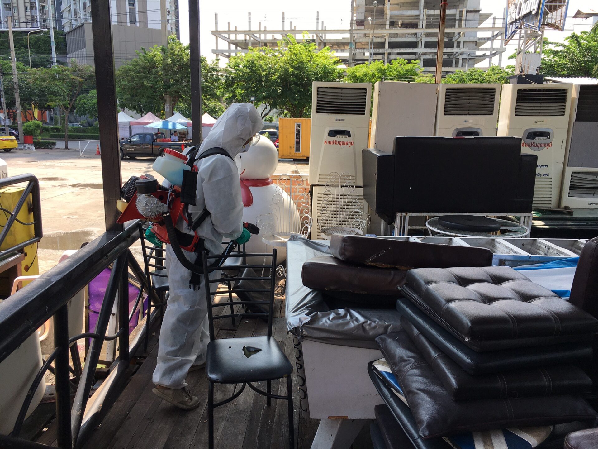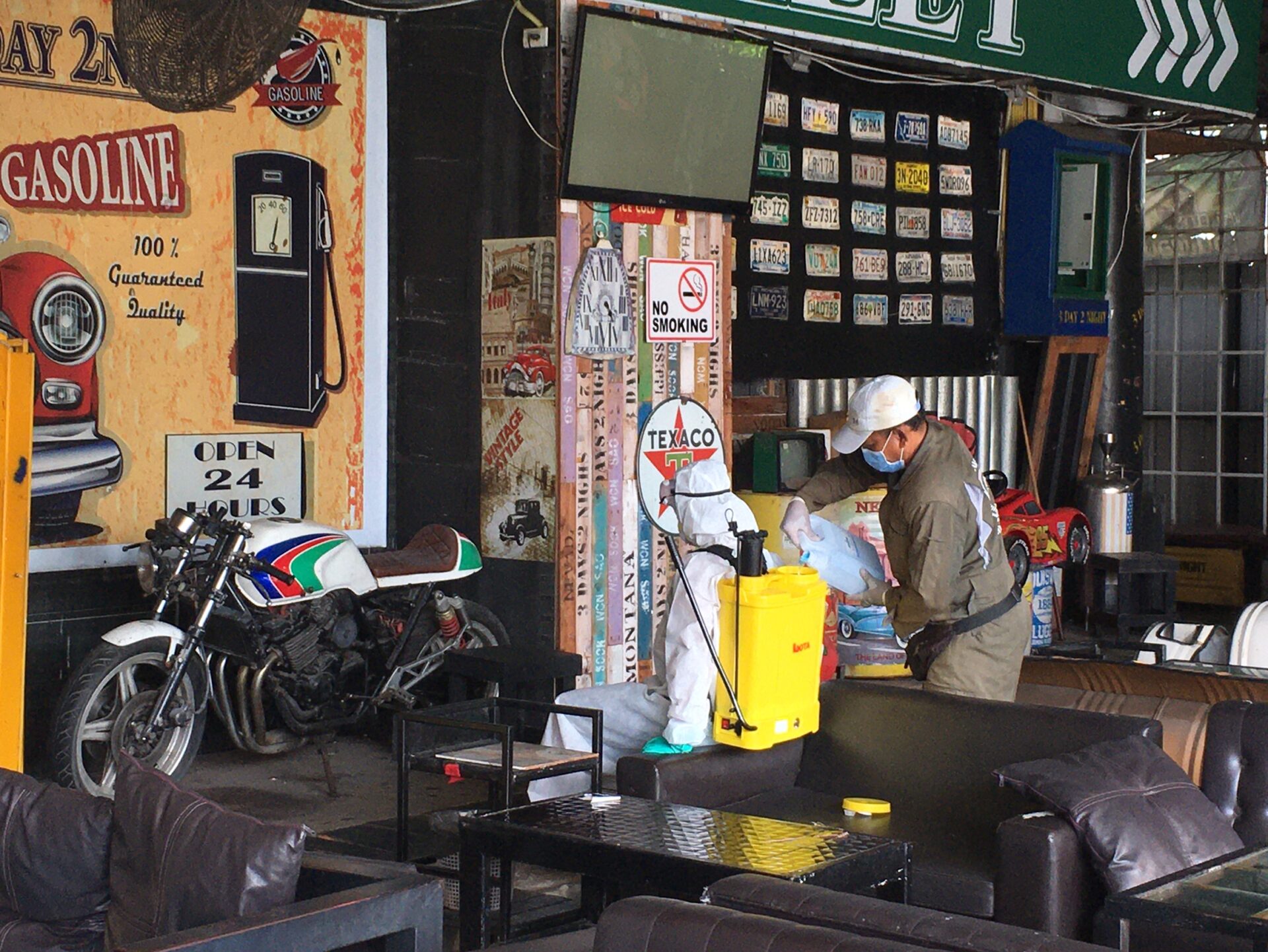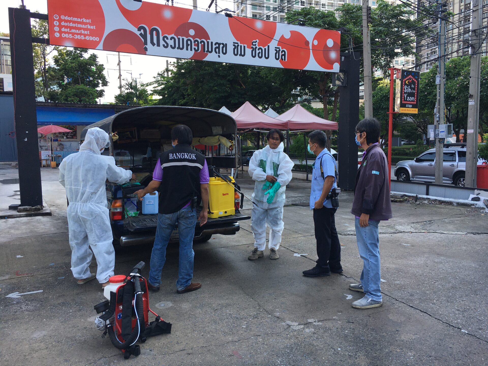 เจ้าหน้าที่ทำการฉีดพ่นน้ำยาฆ่าเชื้อโรครอบร้าน โดยมีเจ้าหน้าที่เขตบางคอแหลม รวมทั้งผู้ดูแลร้านมาคอยดูแล และอำนวยความสะดวก