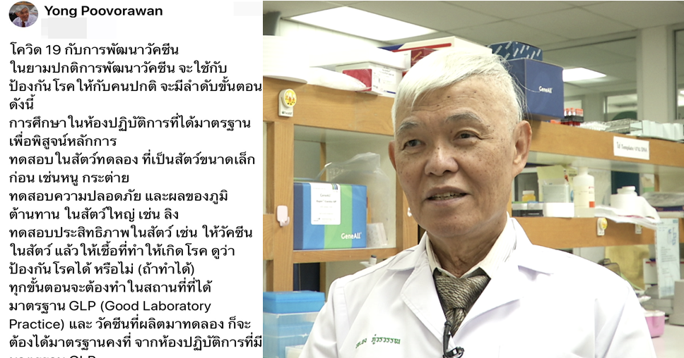 ศ.นพ.ยง ภู่วรวรรณ หัวหน้าศูนย์เชี่ยวชาญเฉพาะทางด้านไวรัสวิทยาคลินิก ภาควิชากุมารเวชศาสตร์ คณะแพทยศาสตร์ จุฬาลงกรณ์มหาวิทยาลัย โพสต์ผ่านเฟซบุ๊ก Yong Poovorawan ว่า โควิด-19 กับการพัฒนาวัคซีน ในยามปกติการพัฒนาวัคซีน จะใช้กับป้องกันโรคให้กับคนปกติ จะมี ลำดับขั้นตอน ดังนี้