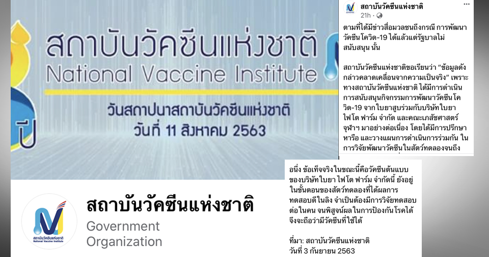 สถาบันวัคซีนแห่งชาติ โพสต์ผ่านเพจเฟซบุ๊ก เมื่อวันที่ 3 กันยายน 2563 ว่า ตามที่ได้มีข่าวสื่อมวลชนถึงกรณี การพัฒนาวัคซีนโควิด-19 ได้แล้วแต่รัฐบาลไม่สนับสนุนนั้น