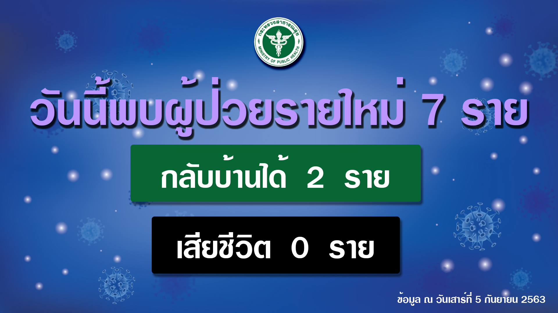 กระทรวงสาธารณสุข (สธ.) รายงานข่าวกรณีโรคติดเชื้อไวรัสโคโรนา 2019 (COVID-19) ประจำวันที่ 5 กันยายน 2563 ว่า สถานการณ์ผู้ติดเชื้อไวรัสโคโรนา 2019 ในประเทศไทยวันนี้ มีผู้ติดเชื้อรายใหม่ 7 ราย ทั้งหมดเป็นผู้ที่เดินทางกลับจากต่างประเทศ (อินโดนีเซีย 1 ราย, สหรัฐอเมริกา 1 ราย, รัสเซีย 2ราย,อินเดีย 2ราย และบังกลาเทศ 1ราย) และเข้ากักตัวในสถานที่รัฐจัดให้ มีผู้ป่วยกลับบ้านได้ 2ราย ทำให้มีผู้ป่วยกลับบ้านสะสม 3,279 ราย หรือคิดเป็นร้อยละ 95.38 ของผู้ป่วยทั้งหมด มีผู้ป่วยที่ยังรักษาอยู่ในโรงพยาบาล 101 ราย หรือร้อยละ 2.94 ของผู้ป่วยทั้งหมด ไม่มีผู้เสียชีวิตเพิ่ม รวมผู้เสียชีวิตสะสม 58 ราย ผู้ป่วยสะสมทั้งสิ้น 3,438 ราย