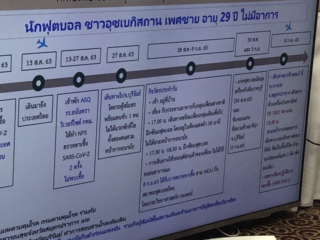 นพ.โสภณ กล่าวว่า สำหรับนักฟุตบอลคนดังกล่าวเป็น มาจากอุซเบกิสถาน เพิ่งเข้าไทยเป็นครั้งแรก พูดภาษาไทยไม่ได้ พูดภาษาอังกฤษไม่คล่อง ก่อนเดินทางเข้าไทยได้ ตรวจหาเชื้อโควิดในรอบ 48 ชม. มาก่อน โดยเริ่มเดินทางมาตั้งแต่วันที่ 11 ส.ค. ถึงไทยวันที่ 13 ส.ค. จากนั้น เข้าใน Alternative quarantine รร.อนัตรา ริเวอร์ไซด์ ตั้งแต่วันที่ 13-27 ส.ค. จำนวน 2 ครั้ง ในวันที่ 3 เมื่อเข้าพัก และวันที่ 11 ของวันเข้าพัก ไม่พบการติดเชื้อโควิด จากนั้น 27 ส.ค. เดินทางไปบุรีรัมย์ ด้วยรถตู้มีคนขับรถ 1 คน ขณะนั้นสวมหน้ากาก และ จากนั้น รวมการฝึกและแข่งขัน ตั้งแต่วันที่ 28 ส.ค.-9 ก.ย. และมีการแข่งขันนัดอุ่นเครื่อง กับทั้ง ราชบุรีมิตรผล และ ขอนแก่นยูไนเต็ต และมีการตรวจเชื้อโควิด-19 ก่อนการแข่งขันเมื่อวัน 8 ก.ย. รายงานพบเชื้อโควิดวันที่ 10 ก.ย. ซึ่งตรงกับวันที่เดินทางมาร่วมแชมป์ฝึกซ้อมก่อนการแข่งขัน ที่จ.สมุทรปราการ โดยเดินทางด้วยเที่ยวบินของแอร์เอเซีย FD3521 ในเวลา 13.50 น. ขณะนี้อาการผู้ป่วยคนดังกล่าวไม่มากและพักรักษาตัวใน รพ.แล้ว โดยครั้งพบว่ามีผู้สัมผัสเสี่ยงสูง 43 คน เป็นนักฟุตบอล 22 คน สตาฟฟ์ 16 คน และเจ้าหน้าที่ 5 คน
