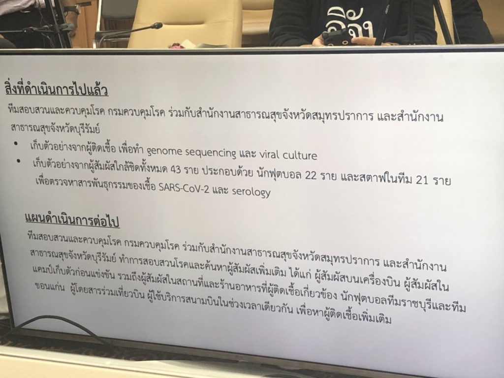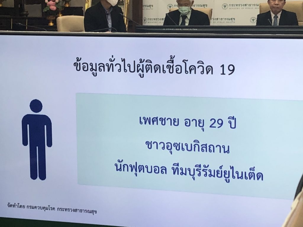 นพ.สุวรรณชัย วัฒนายิ่งเจริญชัย อธิบดีกรมควบคุมโรค พร้อมด้วยนพ.โอภาส การย์กวินพงศ์ อธิบดีกรมวิทยาศาสาตร์การแพทย์ นพ.โสภณ เอี่ยมศิริถาวร ผอ.กองโรคติดต่อทั่วไป และ ศ.นพ.ยง ภู่วรวรรณ หัวหน้าศูนย์เชี่ยวชาญเฉพาะทางด้านไวรัสวิทยาคลินิก ภาควิชากุมารเวชศาสาตร์ คณะแพทยศาสาตร์ จุฬาลงกรณ์มหาวิทยาลัย และนายกรวีร์ ปริศนานันทกุล รองประธานไทยลีก แถลงข่าวกรณีพบนักฟุตบอล ติดเชื้อโควิด-19 จากการตรวจคัดกรองก่อนไทยลีก โดย นพ.โอภาสการตรวจหาเชื้อโควิด-19 นี้ ในนักฟุตบอลนี้ เป็นผลมาจากการ MOU ร่วมกับสมาคมฟุตบอลแห่งประเทศไทย และ กรมวิทยาศาสาตร์การแพทย์ โดยว่าชายคนดังกล่าวที่ติดเชื้อโควิด เป็นนักฟุตบอล จากทีมบุรีรัมย์ ยูไนเต็ด. เป็นชาวอุสเบกิสถาน อายุ 29 ปี ซึ่งการตรวจนี้ใช้วิธี RT-PCR ในการตรวจเชื้อจากนักฟุตบอลไทยลีกส์ ทั้ง 1-2 รวม 28 ทีม และผู้ตัดสิน ผู้ควบคุม รวม 1,115 คน ไม่พบเชื้อ1114 คน ทั้งนี้การตรวจหาเชื้อจะเริ่มก่อนการแข่งขัน เมื่อพบว่ามีคนป่วย ก็จะปฏิบัติตาม พ.ร.บ.โรคติดต่อ เพื่อสอบสวนควบคุมโรค